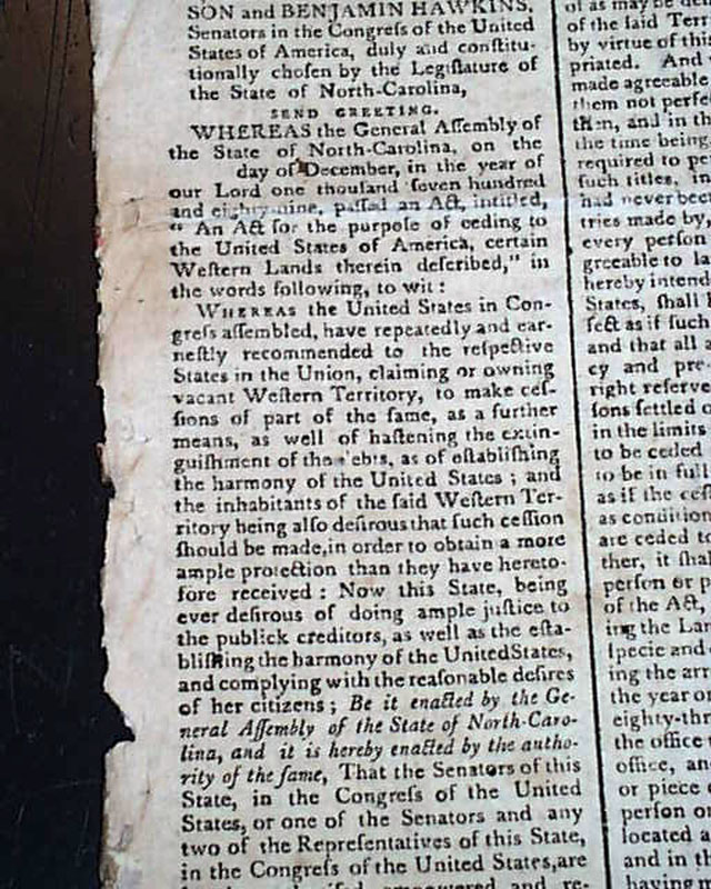 Most of the front page is taken up with an Act of Congress concerning a cession of land in North Carolina, signed in script type by: George Washington, and in block type by Thomas Jefferson & John Adams.