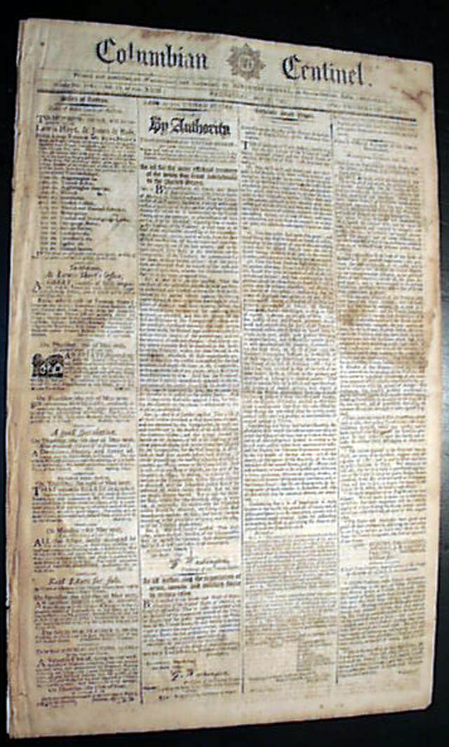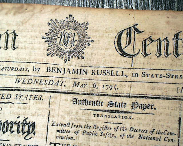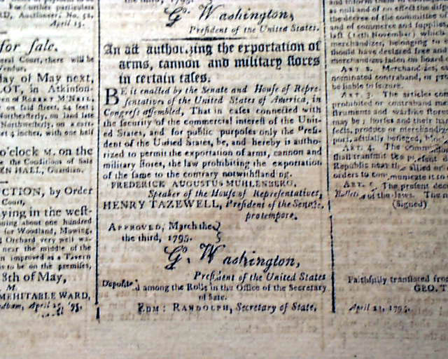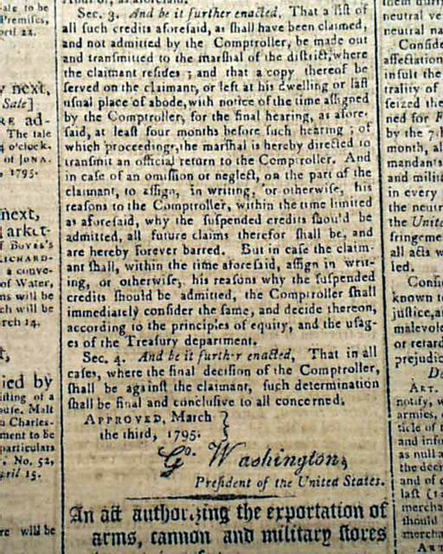 COLUMBIAN CENTINEL, Boston, May 6, 1795  The entire column 2 of the front page is taken up with two Acts of Congress, each signed in script type by the President: Go. Washington. One is for "...authorizing the exportation of arms, cannon and military stores in certain cases."