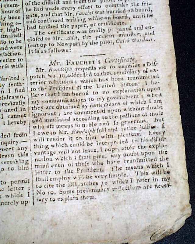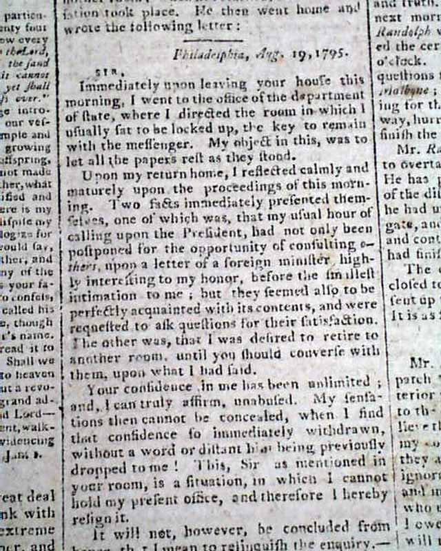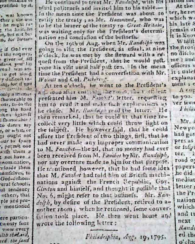 Nearly half of the front page & part of page 2 are taken up with the key letters regarding this scandal, including Randolph's letter of Aug. 19, and Washington's letter to Randolph of Aug. 20, 1795 signed in type: Go. Washington. The article is headed: "More And More Of and About Mr. Randolph!".