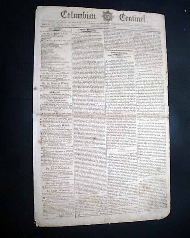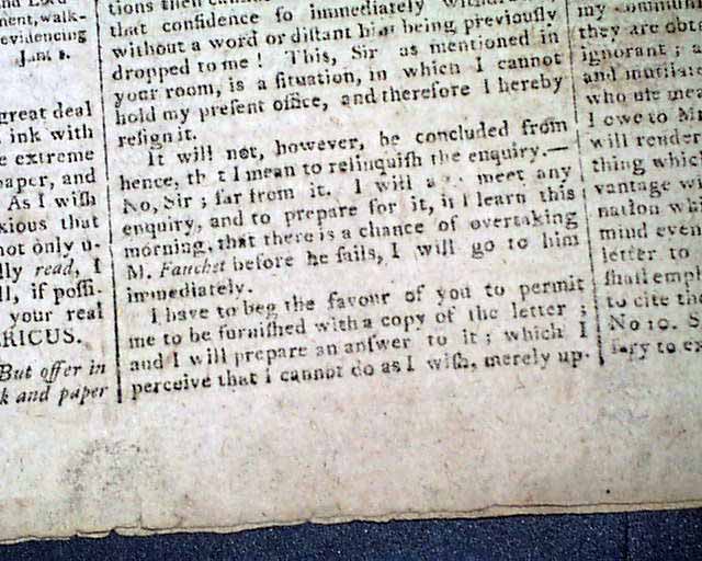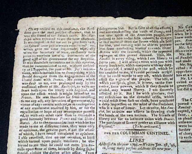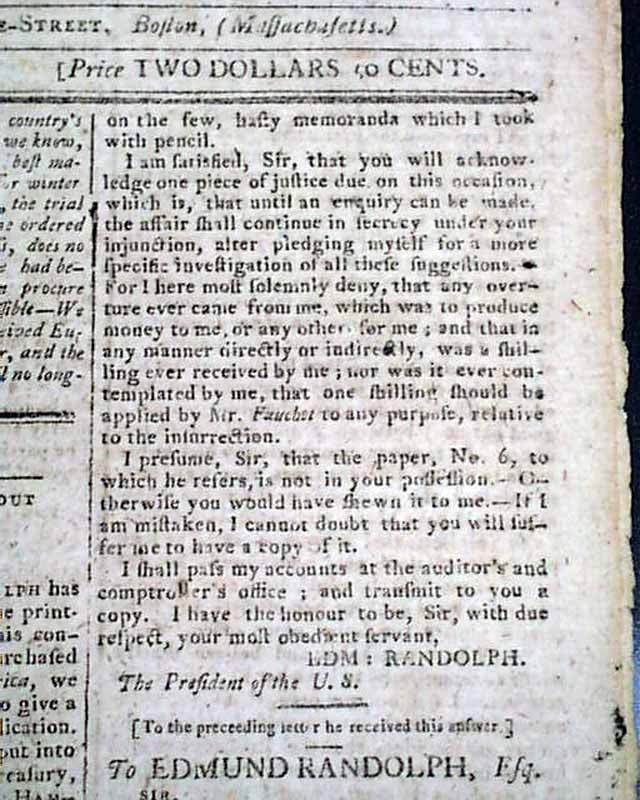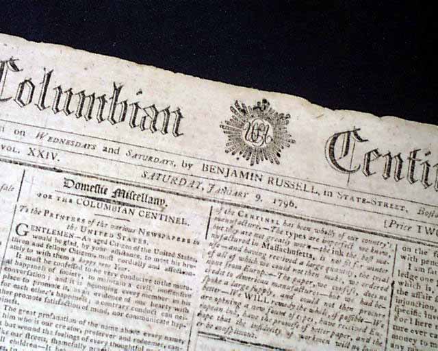 COLUMBIAN CENTINEL, Boston, Jan. 9 1796 The front page has several crucial letters on the scandal involving Sec. of State Edmund Randolph which would result in his resignation.