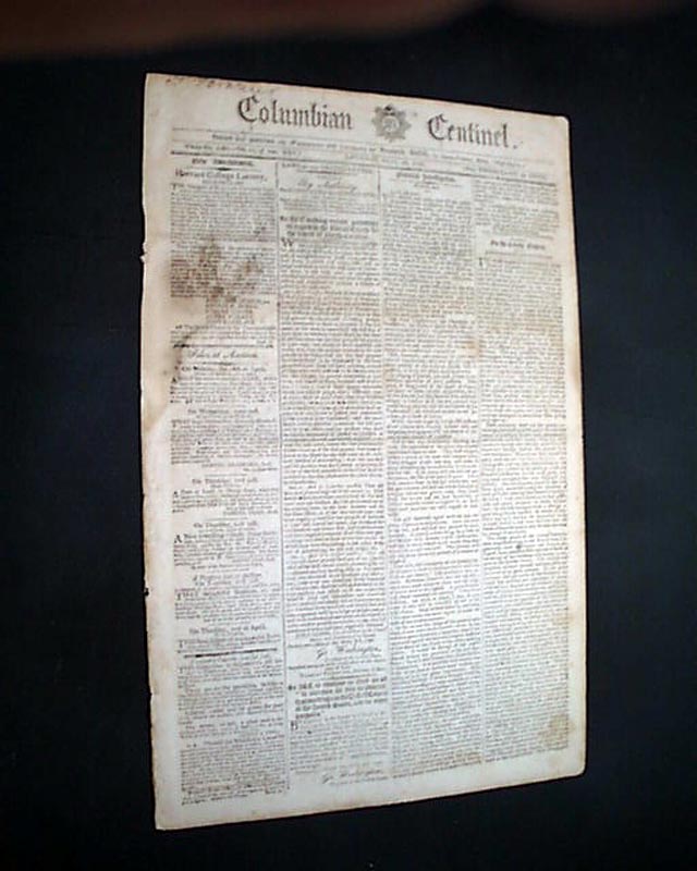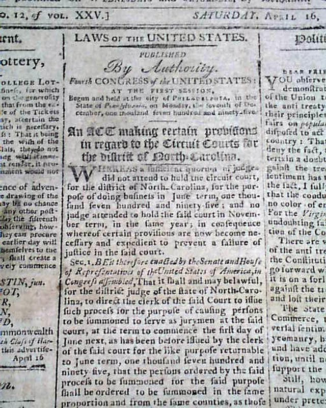 COLUMBIAN CENTINEL, Boston, April 16, 1796 The front page features two Acts of Congress concerning courts, each signed in script type by the President: Go. Washington.