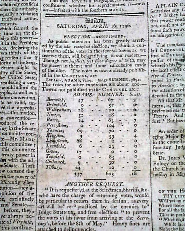 Page 2 has a chart of the latest count for the election of Mass. governor, showing Judge Sumner leading over Gov. Sam Adams.