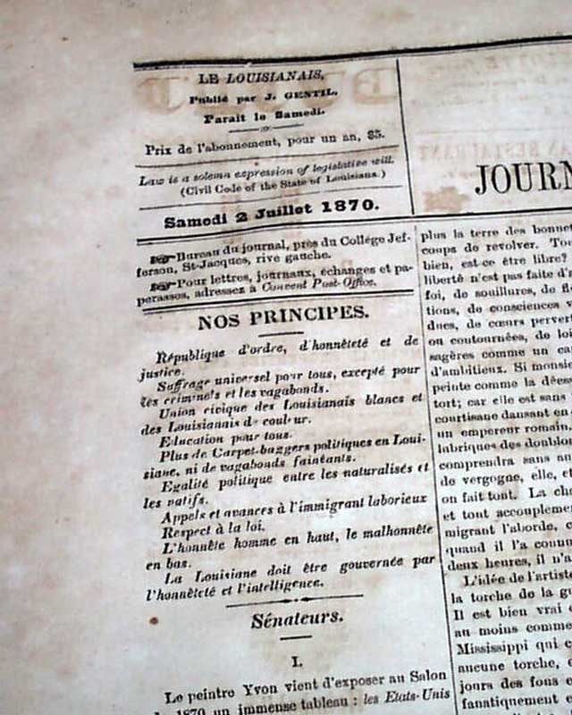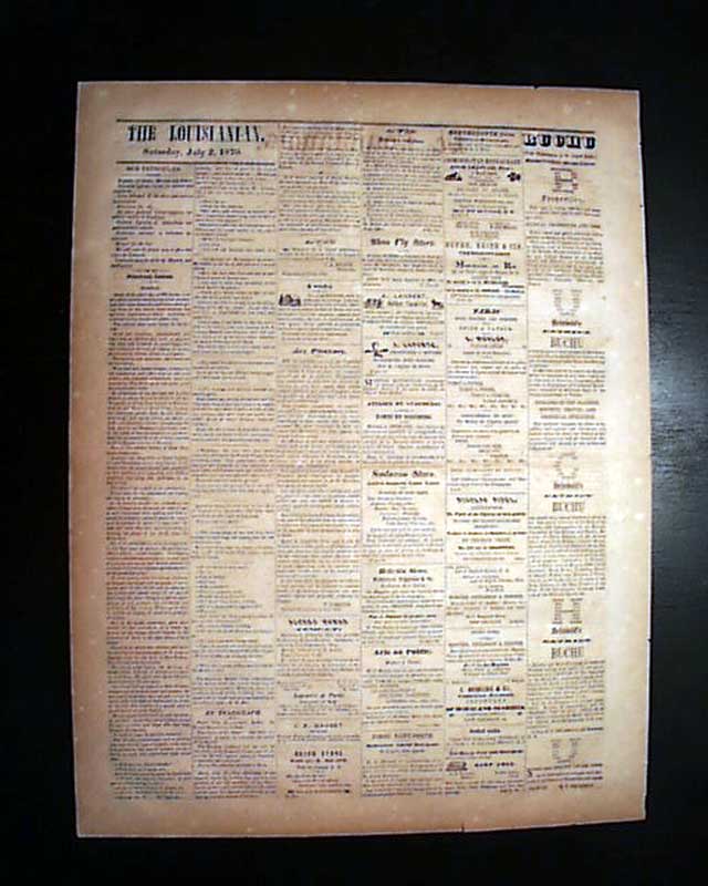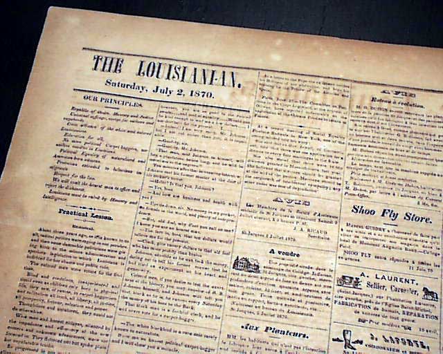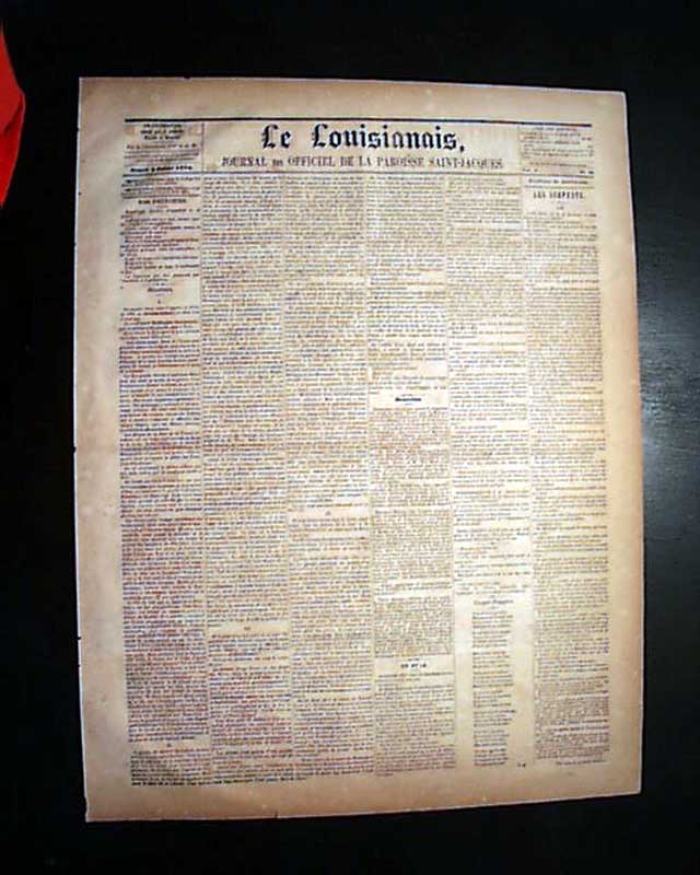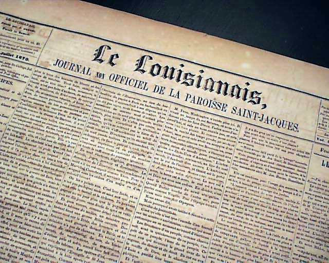 LE LOUISIANAIS, Convent, Louisiana, July 12, 1870 A scarce title which existed from 1865 thru 1883, but of which very few issues surface. It is a single sheet newspaper with the front entirely in French while the reverse is in English save for the advertisements, most being in French.