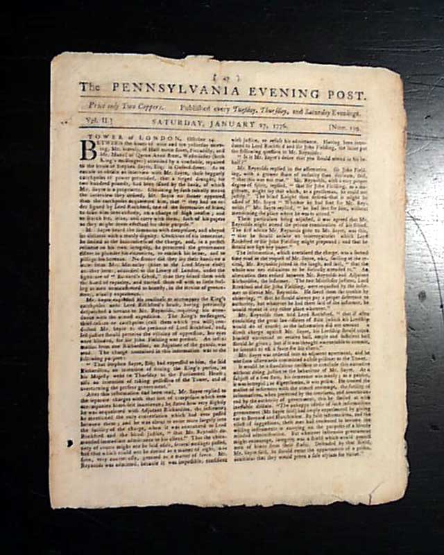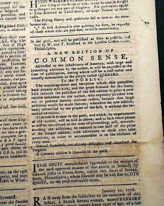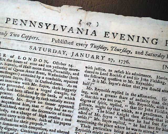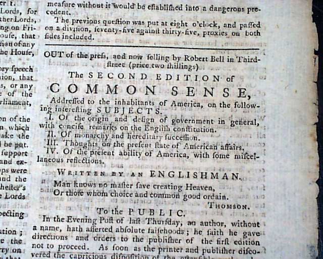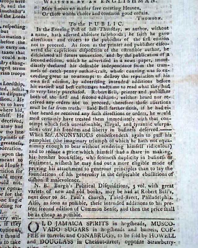 THE PENNSYLVANIA EVENING POST, Philadelphia, Jan. 27, 1776 Printer Robert Bell ran an advertisement taking most of a column on page 3 attacking both Paine and Bradford and ingenuously accusing them of "dishonest malevolence." He also continued his efforts to sell his own second edition of Thomas Paine's famous work 'Common Sense'.