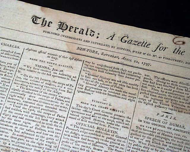 THE HERALD; A GAZETTE FOR THE COUNTRY, New York, April 22, 1796 A very typical late 18th century American newspaper with a good mix of news reports of the day and advertisements. A fine opportunity for an early newspaper at a low price.