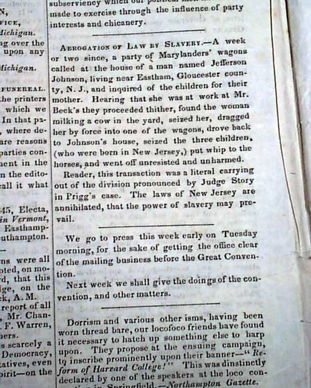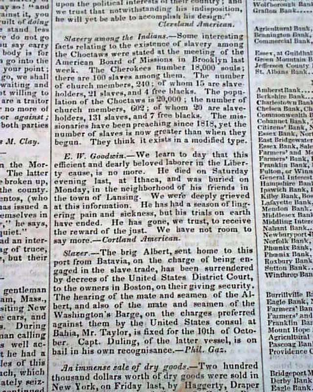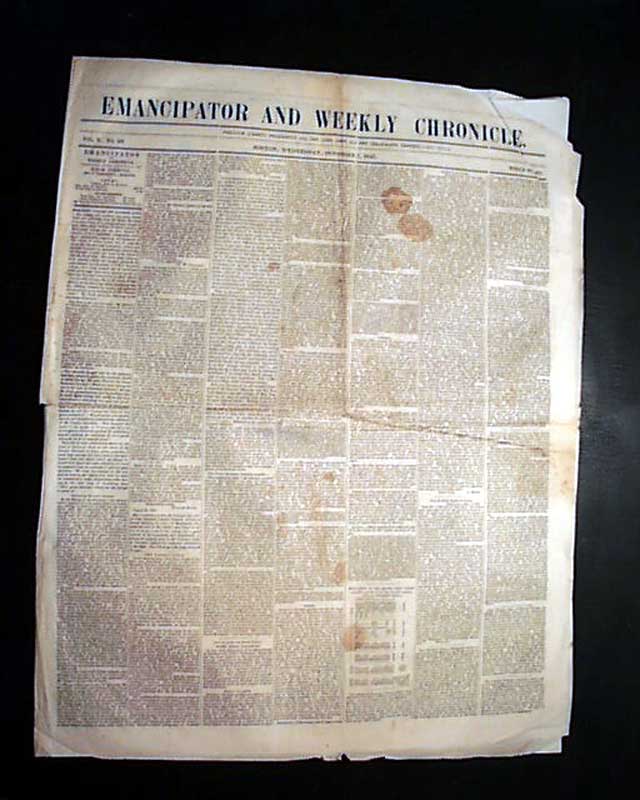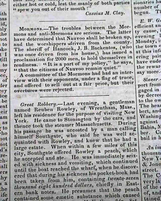 EMANCIPATOR & WEEKLY CHRONICLE, Boston, Oct. 1, 1845 One of the less common anti-slavery newspapers with content as you might suspect. Page 3 has: "Mormons" noting in part: "The troubles between the Mormons and anti-Mormons are serious. The latter have determined that Nauvoo shall be broken up, and the worshippers driven from the county. The sheriff...has issued s proclamation for 2000 men to hold themselves in readiness...committee of the Mormons had had an interview with their opponents... and offered to sell out at a fair price, but their overtures were rejected."