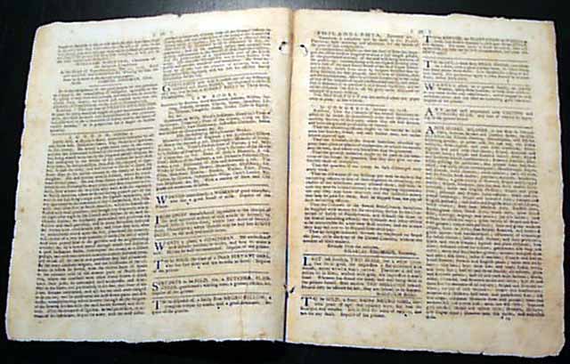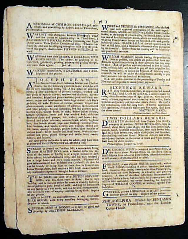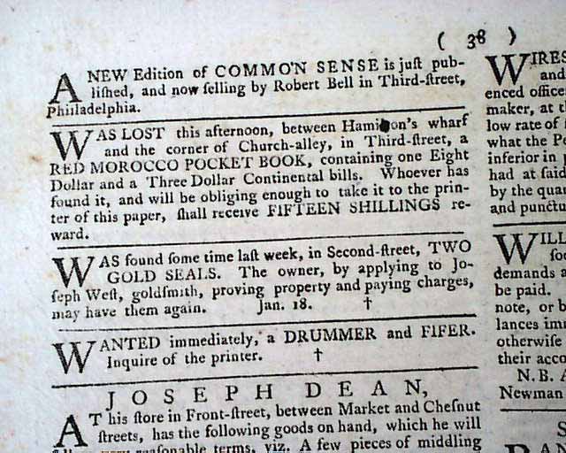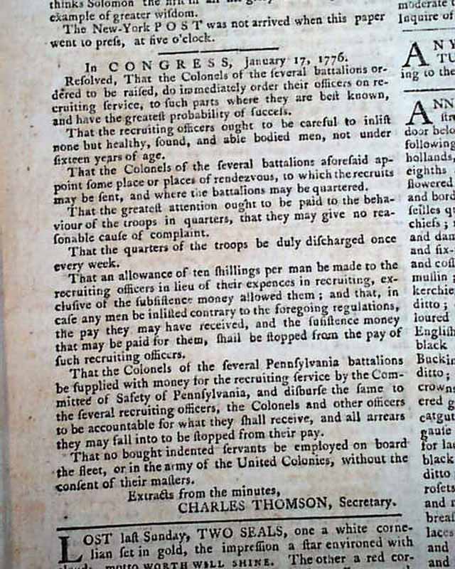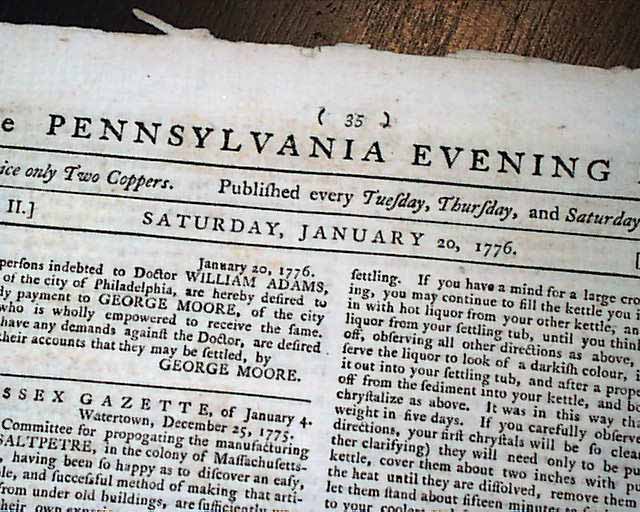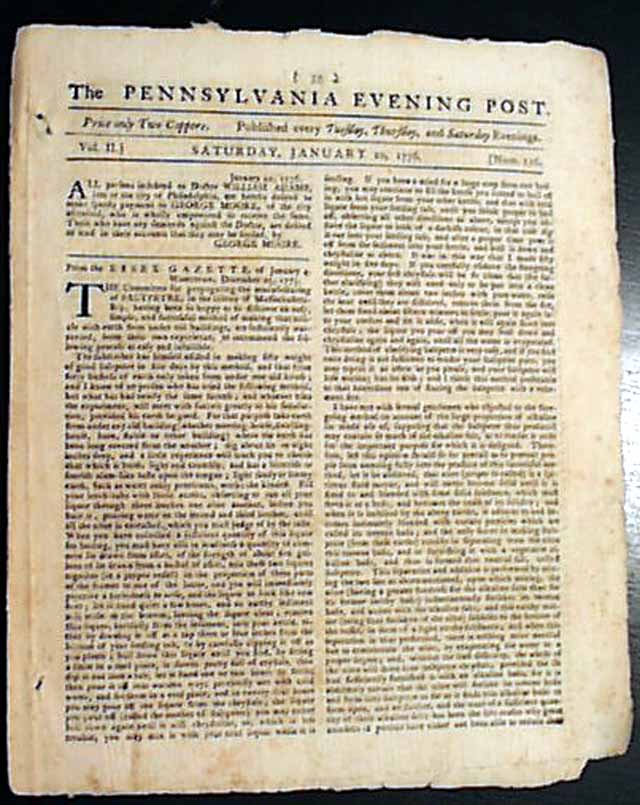 THE PENNSYLVANIA EVENING POST, Philadelphia, Jan. 20, 1776 Great to offer an American newspaper dated in 1776 and from Philadelphia.