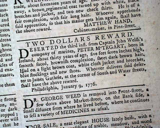Also on the back page is a short ad reading: "Wanted immediately, a DRUMMER and FIFER. Inquire of the printer." The back page also has a "Two Dollars Reward" ad for a marine who deserted from Capt. John Welsh's company.