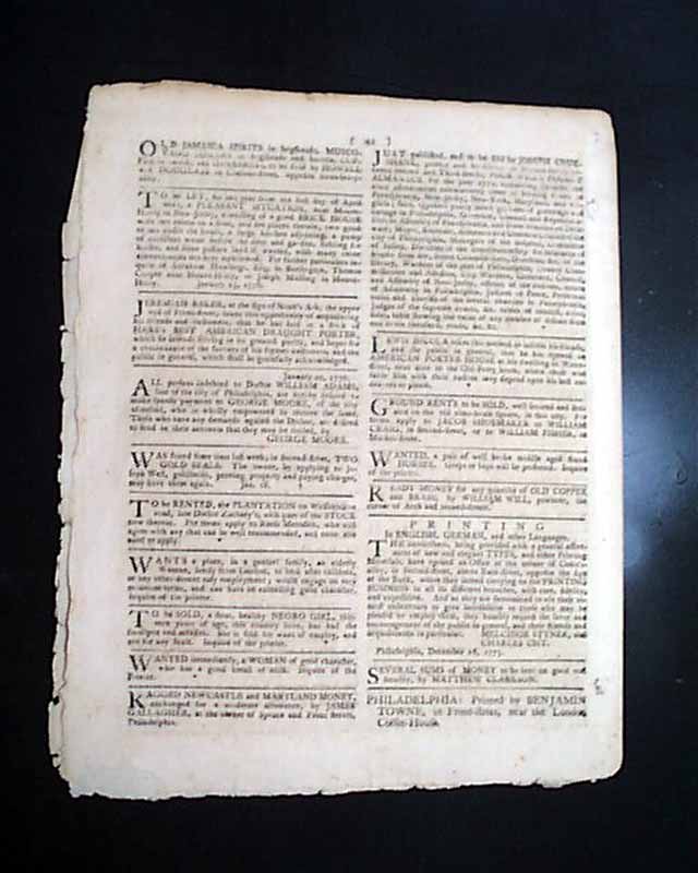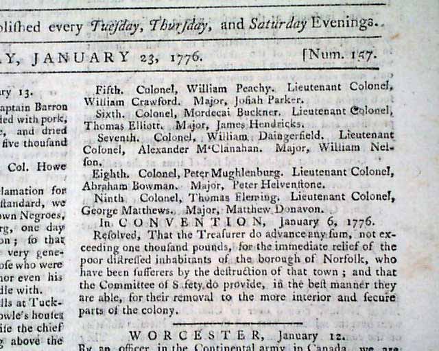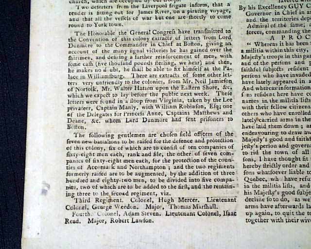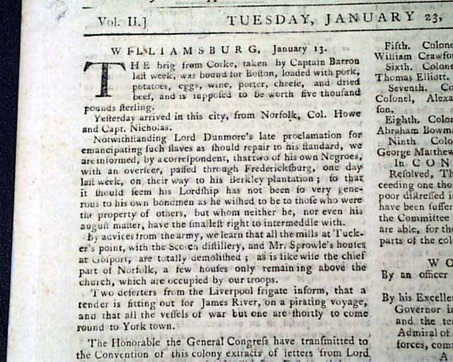 The entire front page has some nice content concerning the Revolutionary War including over a full column of reports from Williamsburg which note in part: "Notwithstanding Lord Dunmore's late proclamation for emancipating such slaves as should repair to his standard, we are informed...that two of his own Negroes, with an overseer, passed through Fredericksburg...so that it should seem his Lordship has not been so very generous to his own bondmen as he wished to be to those who were the property of others...".