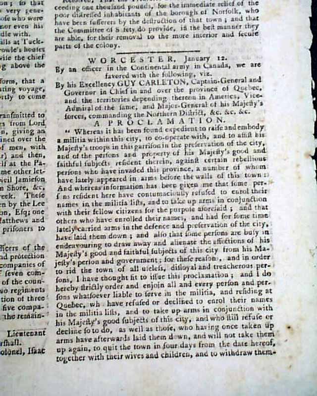 Also on the front page is "A Proclamation" by Guy Carleton at Quebec concerning the protection of the city, with the text carrying over to page 2 where it is signed in type: Guy Carleton. Page 2 also has a report noting: "...a detachment consisting of 3 or 400 men under command of Major Nolton crossed over to Charlestown...the affair was conducted with the utmost silence, prudence, regularity & spirit; the houses were set on fire as directed...The regulars in the fort of Bunker's Hill did not act with those gentleman who labour hard to intimidate us with the superiority of red coats over brown coats..." with more.