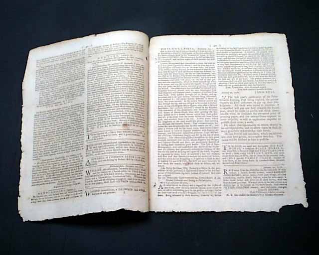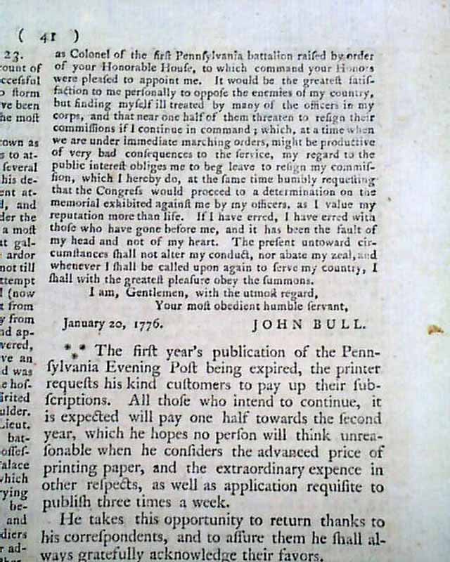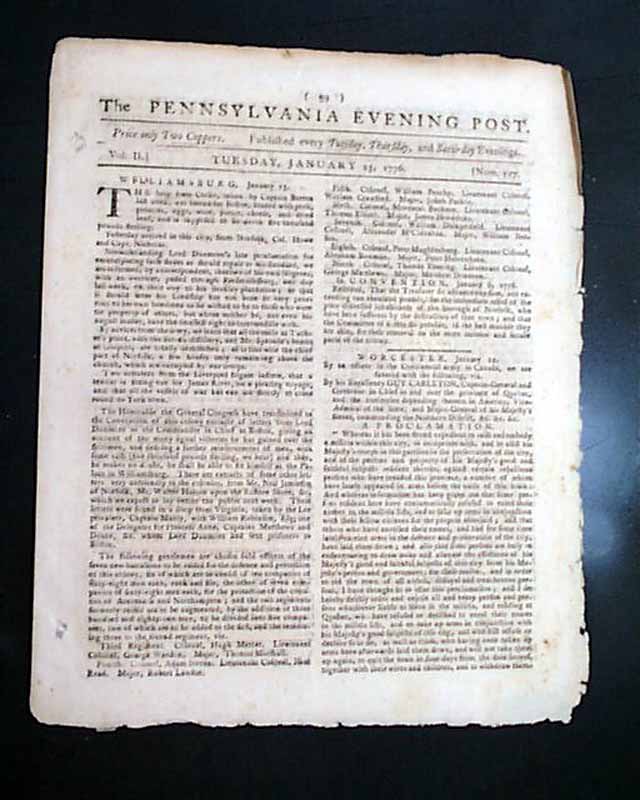 THE PENNSYLVANIA EVENING POST, Philadelphia, Jan. 23, 1776 It is great to offer an American newspaper that is both dated 1776 and from Philadelphia.