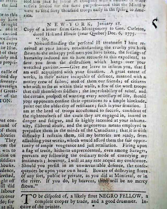 Also a letter from Hqts. at Cambridge signed in type: Horatio Gates, concerning all soldiers: "...under the immediate command of his Excellency General Washington who are absent..." must return to duty or be punished as deserters. Page 2 also has a "...letter from Gen. Montgomery to Gen. Carleton dated Holland House, near Quebec..." warning about treatment of prisoners, etc.