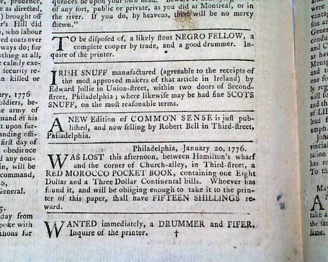 Page 3 contains a brief advertisement reading: "A New edition of COMMON SENSE is just published, and now selling by Robert Bell in Third street, Philadelphia." Interesting that this is an "unauthorized" edition not approved by Thomas Paine. Paine & Bell failed to come to an agreement for a 2nd edition but Bell printed one anyway, but not including the additions which Paine added & which was printed by another printer.