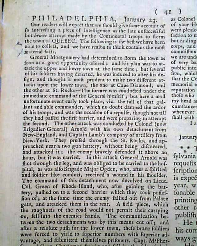 Page 3 has almost a full column with a great account prefaced with: "...should give some account of so interesting a piece of intelligence as the late unsuccessful but brave attempt made by the Continental troops to storm the town of Quebec...". What follows is a fine account of the history Battle of Quebec, in which General Montgomery would die.