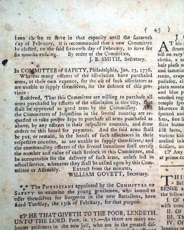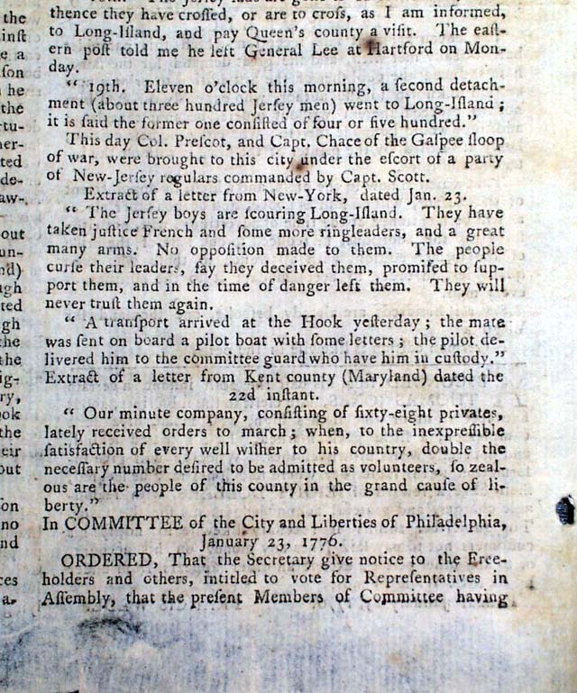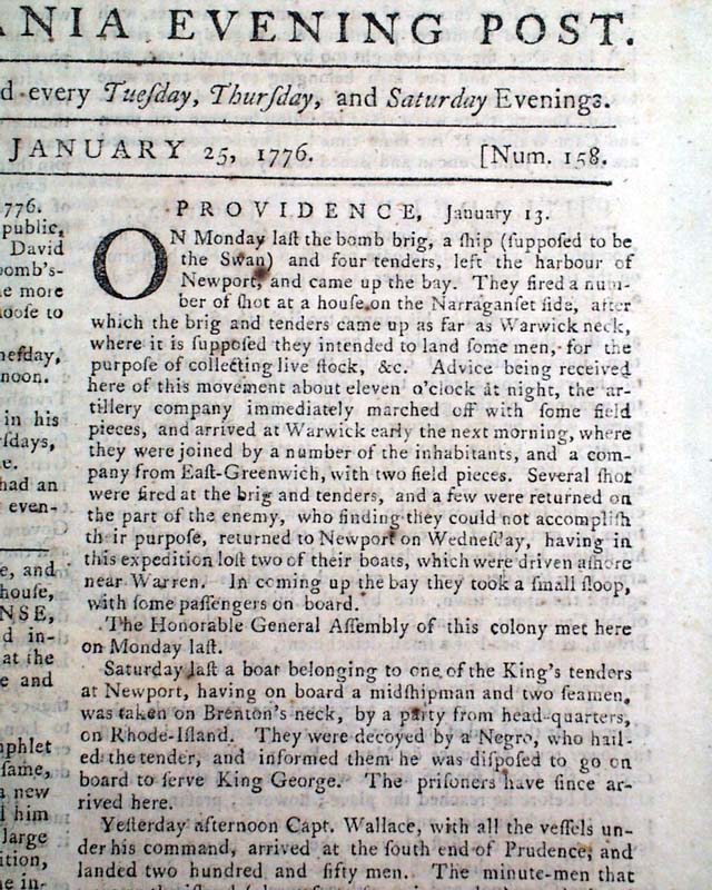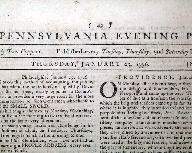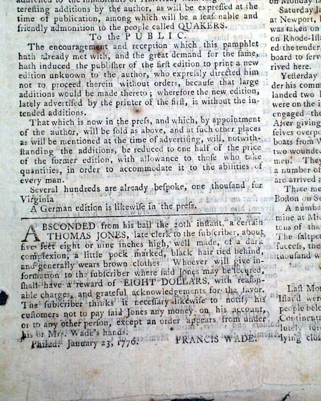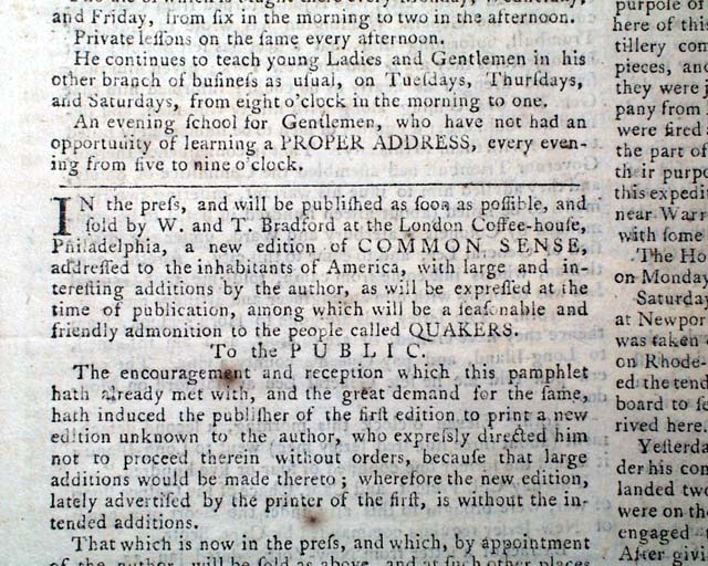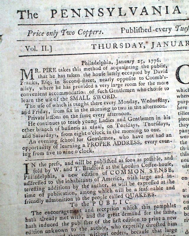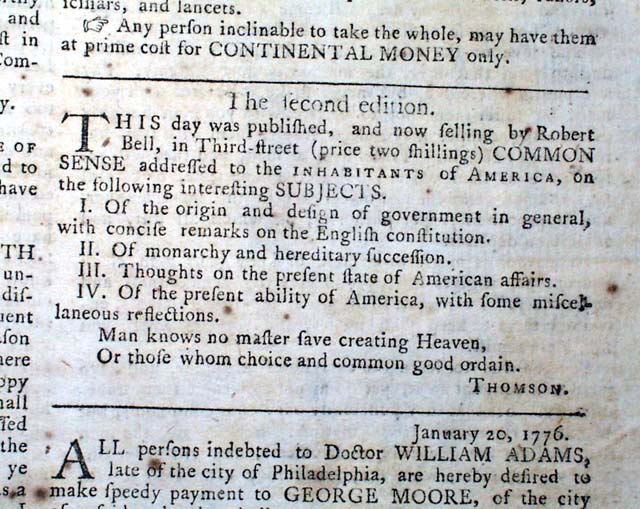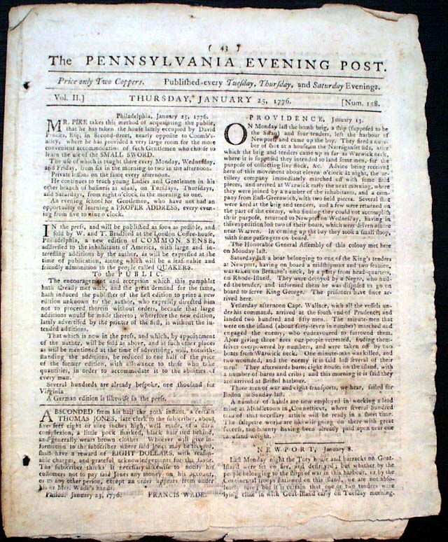 THE PENNSYLVANIA EVENING POST, Philadelphia, Jan. 25, 1776 As a bit of a back story, printer Robert Bell ran an advertisement taking most of a column in the January 27 issue attacking both Paine and Bradford and ingenuously accusing them of "dishonest malevolence." He also continued his efforts to sell his own second edition of Thomas Paine's famous work 'Common Sense'.