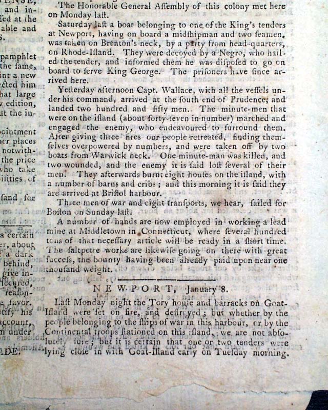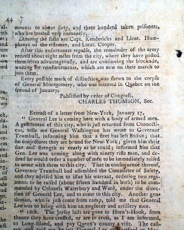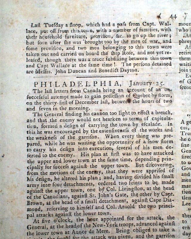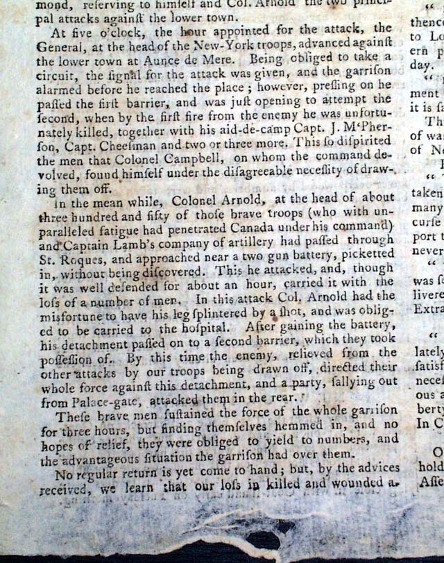 Page 2 has a lengthy account: "...from Canada bring(ing) an account of an unsuccessful attempt made to gain possession of Quebec by storm on the 31st of December last...". This is the battle of Quebec at which General Montgomery would die. This account also includes: "...In the mean while, Colonel Arnold, at the head of about 350 of those brave troops...This he attacked and, though it was well defended for about an hour, carried it with the loss of a number of men. In this attack Col. Arnold had the misfortune to have his leg splintered by a shot & was obliged to be carried to the hospital...". This injury would plague Benedict Arnold for the remainder of his life.