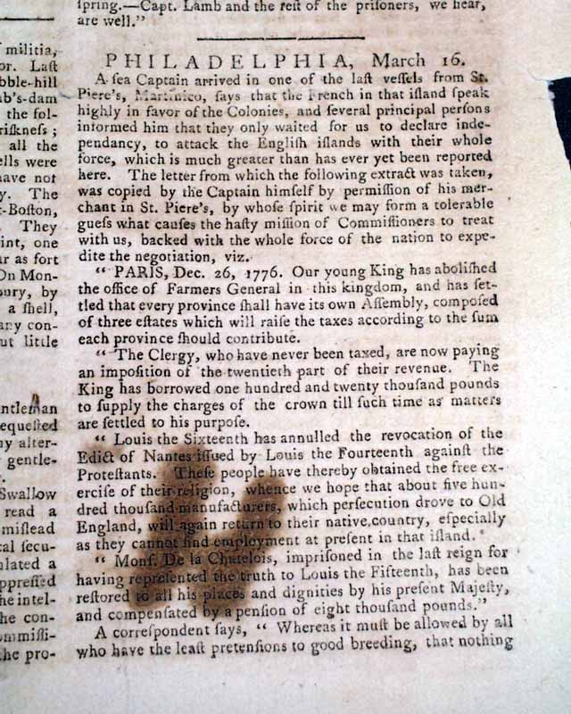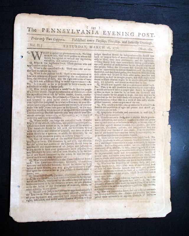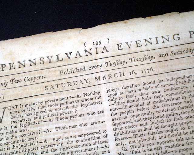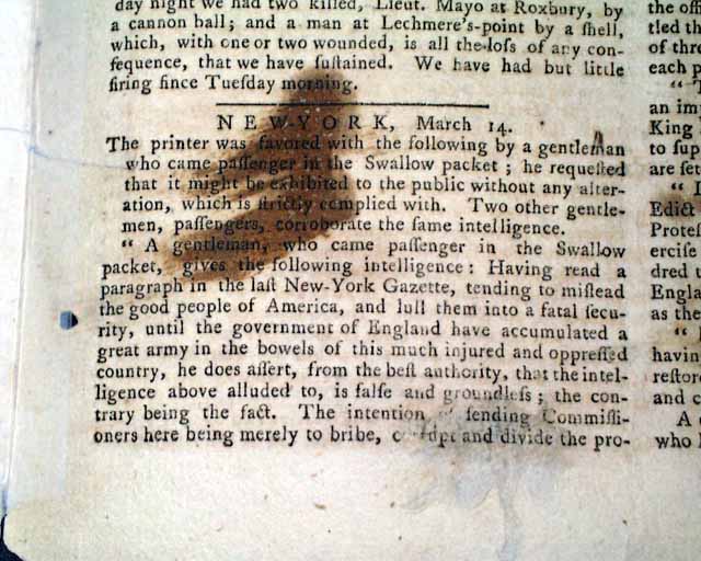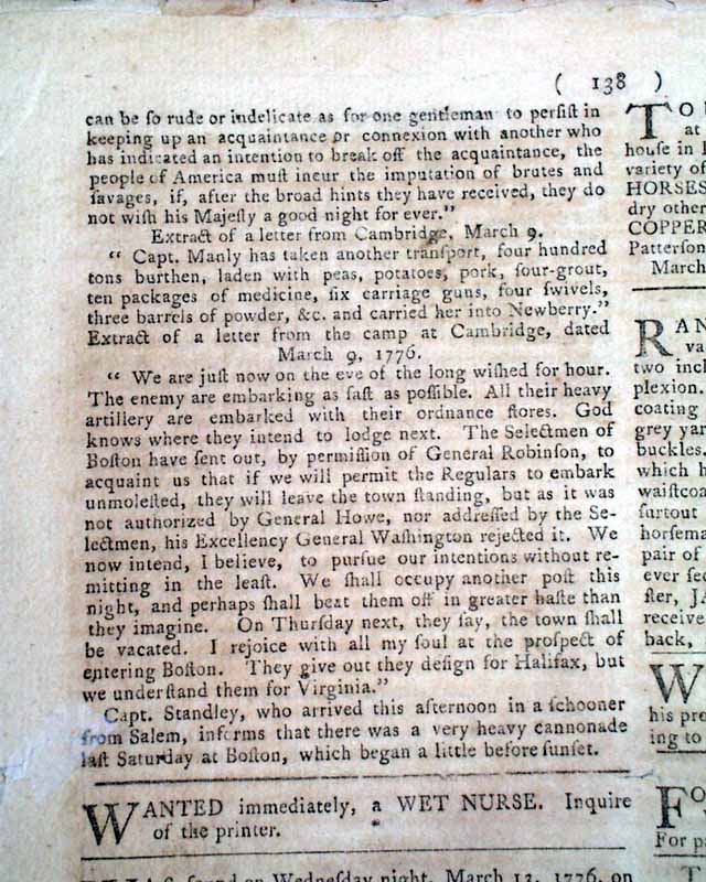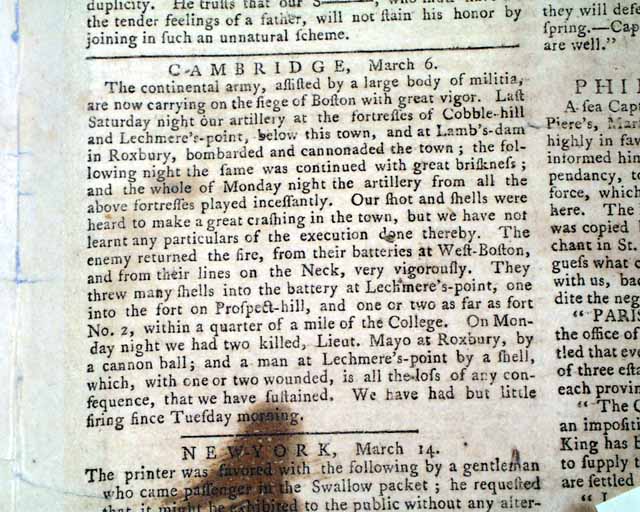 PENNSYLVANIA EVENING POST, Phila., March 16, 1776  Regarding the siege of Boston... a page 3 report headed "Cambridge" includes: "...the continental army, assisted by a large body of militia, are now carrying on the siege of Boston....our artillery at the fortresses of Cobble-hill and Lechmeres point, below this town, and at Lambs dam in Roxbury, bombarded and cannonaded the town....The enemy returned the fire, from their batteries at West Boston....They threw many shells...one into the fort at Prospect-hill, and one or two...within a quarter mile of the College...". Additionally, a back page letter from Cambridge mentions "his Excellency General Washington".