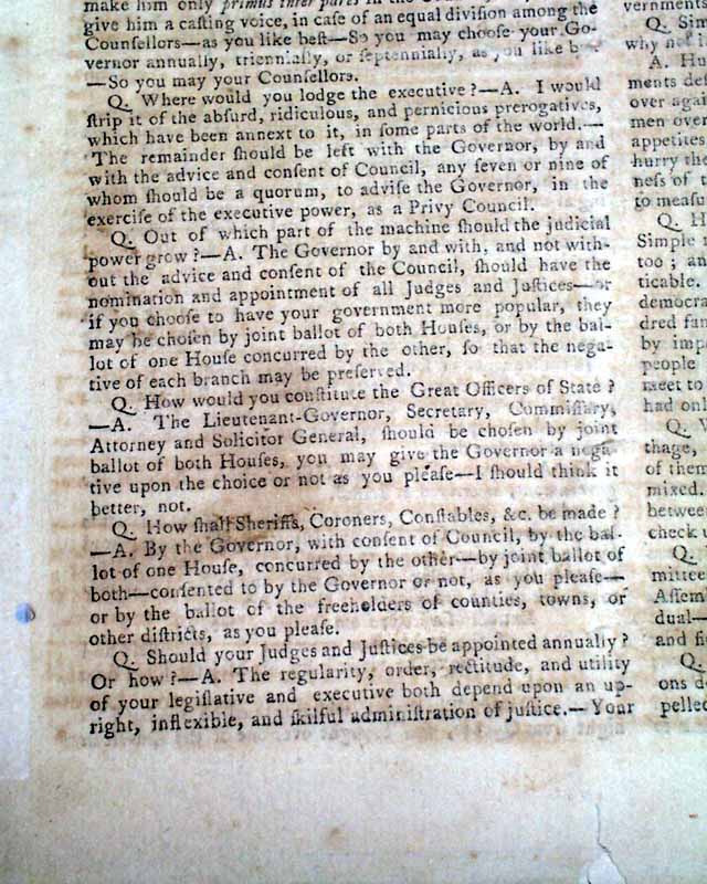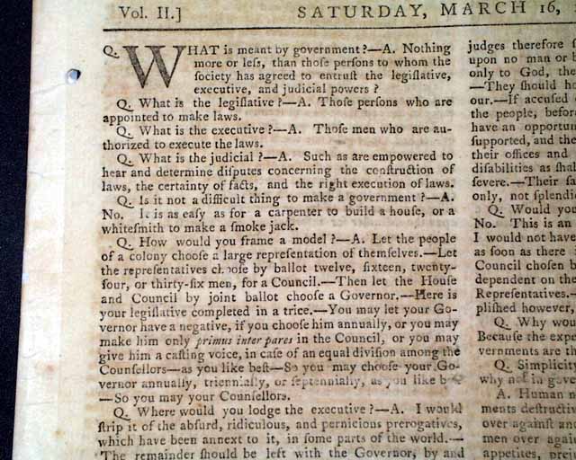 The entire front page is taken up with a question/answer session concerning the various types of governments, the pros & cons of each, how governments are set up, etc. Curious that it mentions that: "...a simple democracy in a large community is impracticable. Such a thing never existed but one...".