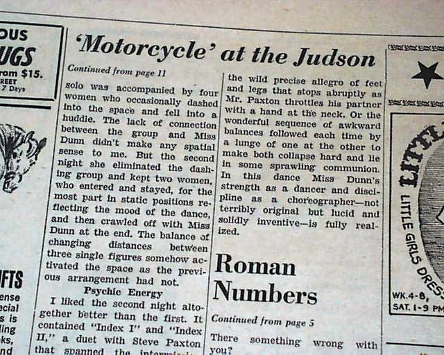 The feature article of this issue is an early piece done by cultural critic and icon, Jill Johnston under "dance" titled "Motorcycle by Jill Johnston" Continues on the following page. This is certainly a fine original printing to have for those who collect Johnston-related material.