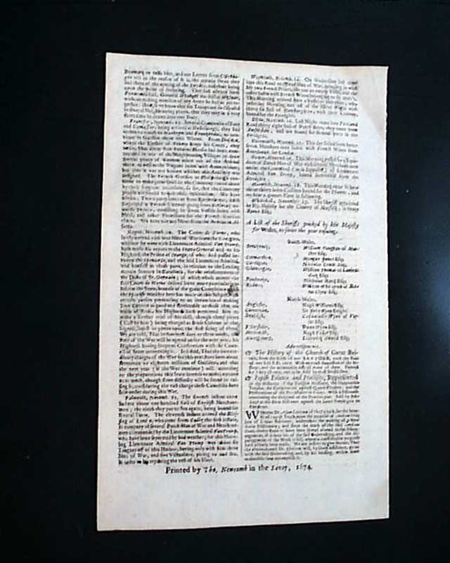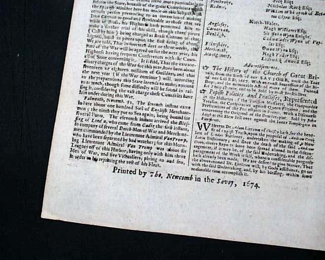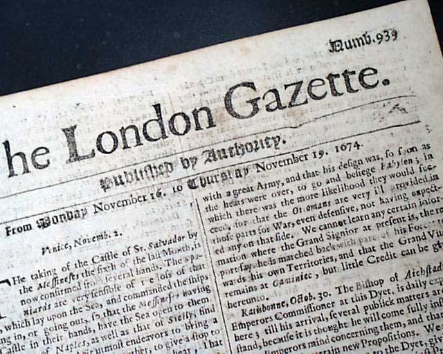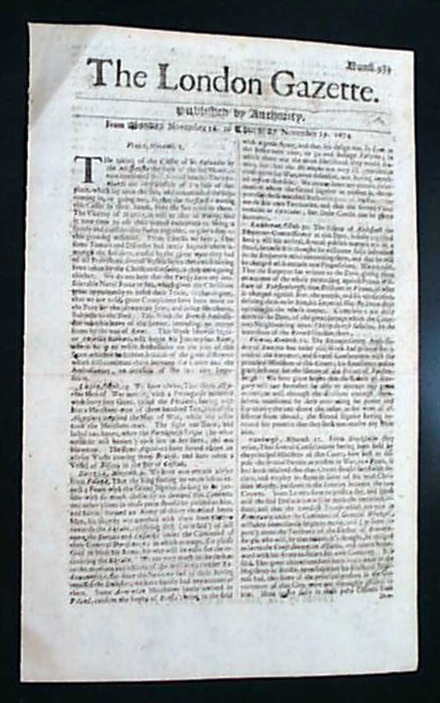 THE LONDON GAZETTE, England, Nov. 19, 1674 The front page begins with a report datelined at Venice, noting in part: "...The Viceroy of Naples, as well as that of Sicily, find it now time to use their utmost endeavors to being a speedy and considerable force together to give a stop to this growing mischief...Complaints have been made to the Port by the Armenian Jews, and other merchants, subjects to the Turk...".