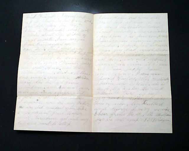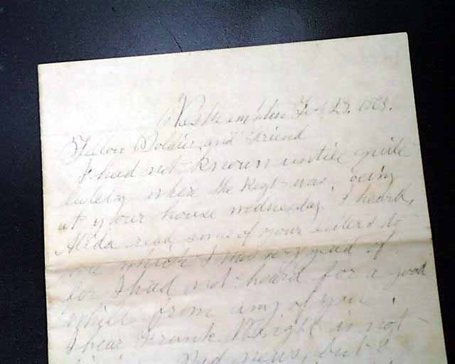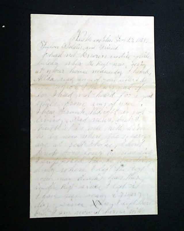 The letter is written to the soldier's: "Fellow Soldier and Friend" and begins: "I had not known until quite lately where the Regt. was..." with more. The writer is on furlough which will: "...expire about the middle of next month...". Various talk about family & friends, the health of others, the death of a friend, etc.