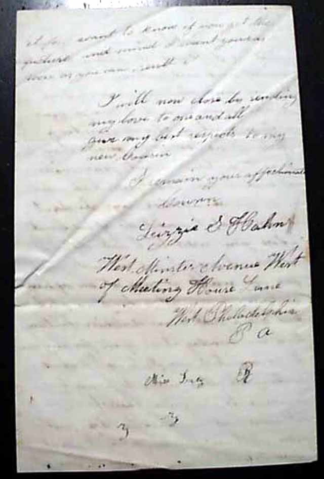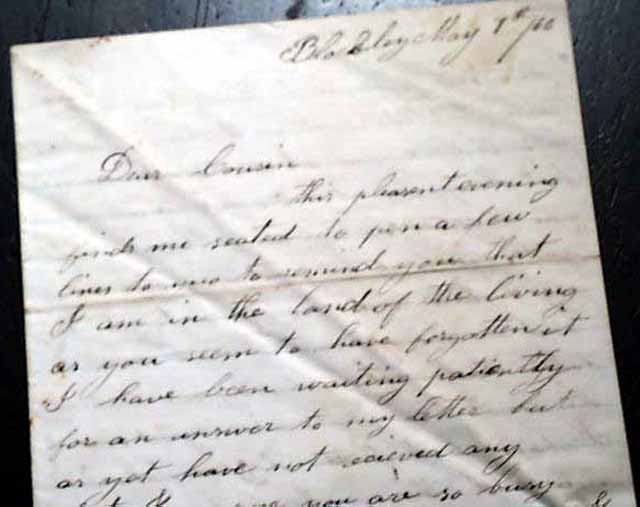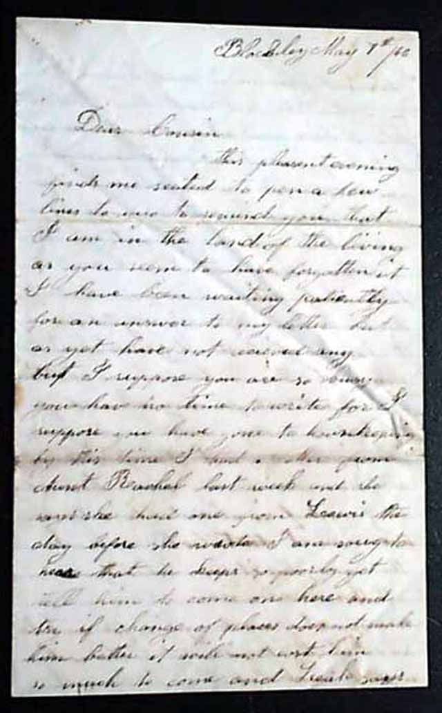 A letter datelined: "Blacksley, May 7th, 1866" written to the writer's: "Dear Cousin" who lives on Westminster Ave., West Philadelphia, Pa. One bit notes: "...I am in the land of the living as you seem to have forgotten it. I have been waiting patiently for an answer to my letter but as yet have not received any..." with various other innocuous items.