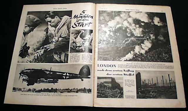 The full front page shows German pilots returning from a bombing mission over England. Several photos show the results of the bombing raids, known as the "Battle of Britain".