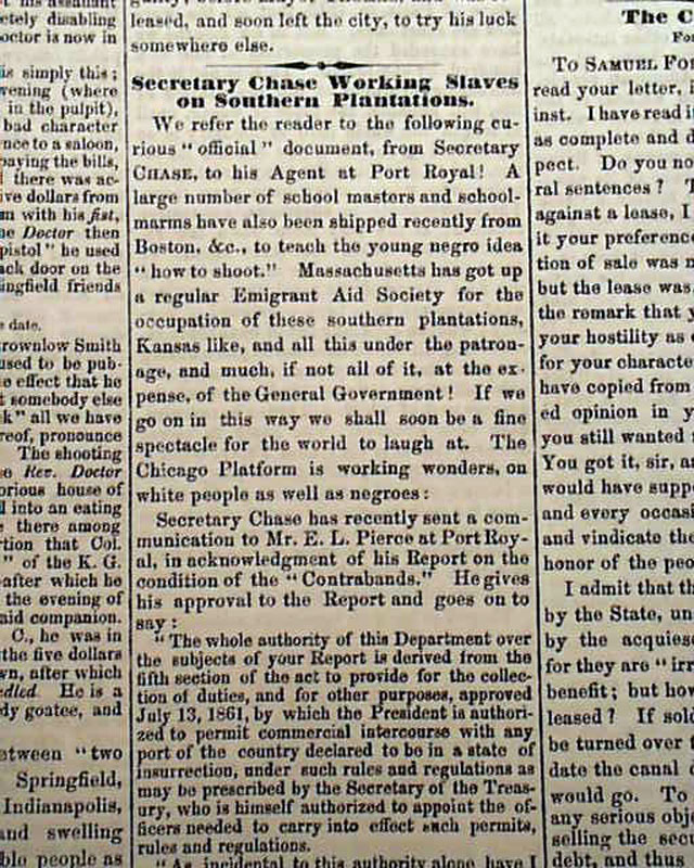 The front page begins with: "Are the Abolition, Free Negroites to Force this War into One of Emancipation?" which is a prophetic article. Also: "Sec. Chase Working Slaves on Southern Plantations". Inside has over half a page on the continued: "Reflections On The Present Crisis".