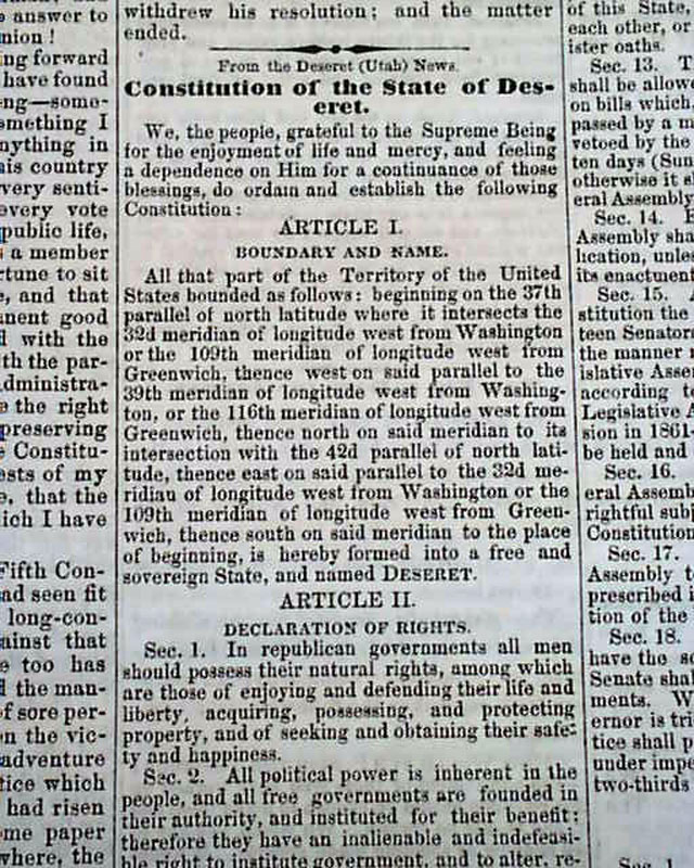 Another page is mostly taken up with: "Constitution of the State of Deseret", present-day Utah. Another page has a short editorial headed: "Utah" which begins: "As the State of Deseret (Utah) will soon be knocking at the door of Congress for admission, we publish the Constitution just adopted...".