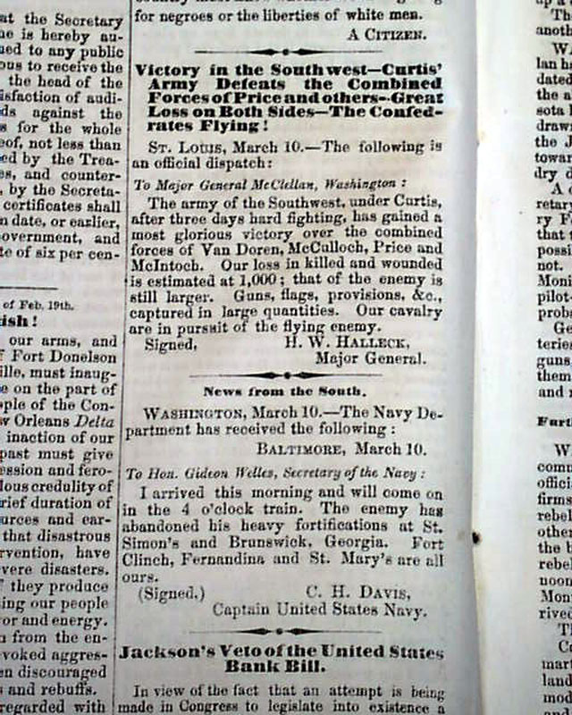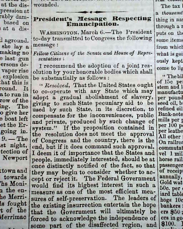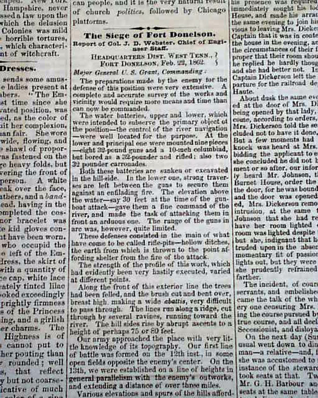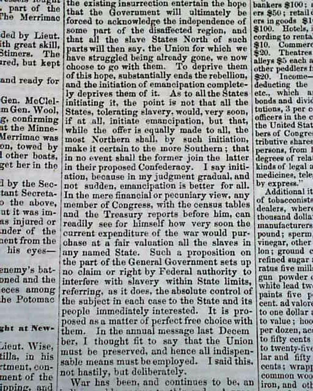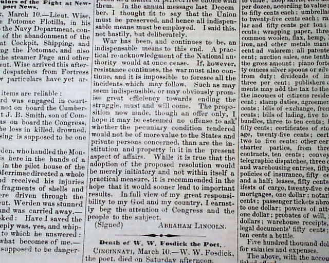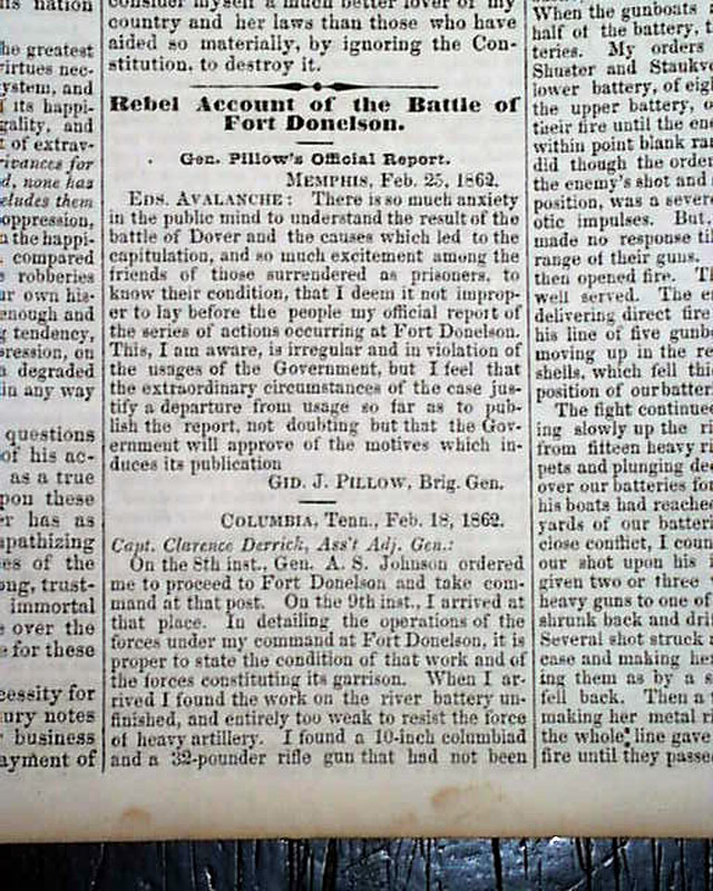 Also: "President's Message Respecting Emancipation" which is signed in type: Abraham Lincoln; "Rebel Account the Battle of Fort Donelson" which takes over half a page is is signed in type: Gid J. Pillow, Brig. Gen. C.S.A.; The Siege of Fort Donelson" and even more.