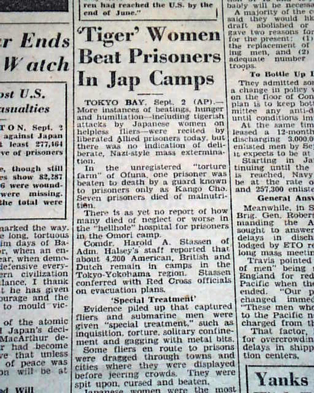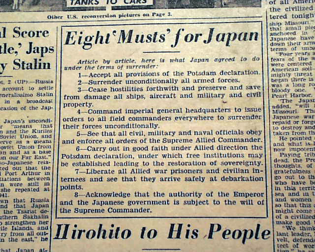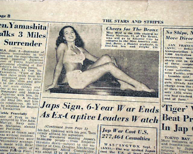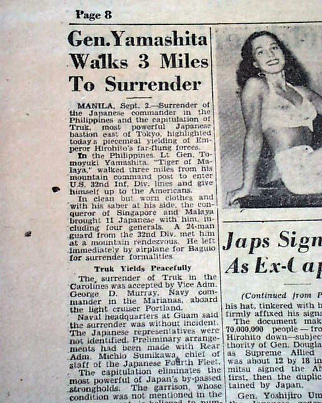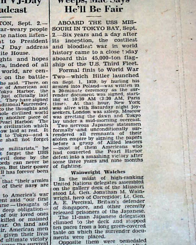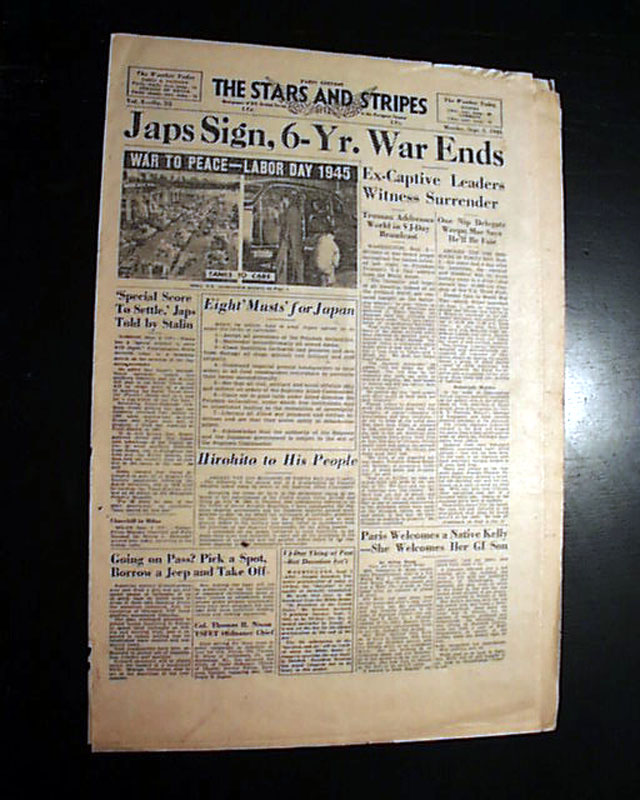 Although the fighting with Japan ended August 14, the war was not officially over until the surrender documents were signed aboard the U.S.S. Missouri on September 2. This newspaper--a military newspaper no less--has a banner headline: "Japs Sign, 6-Yr. War Ends" with various related subheads.