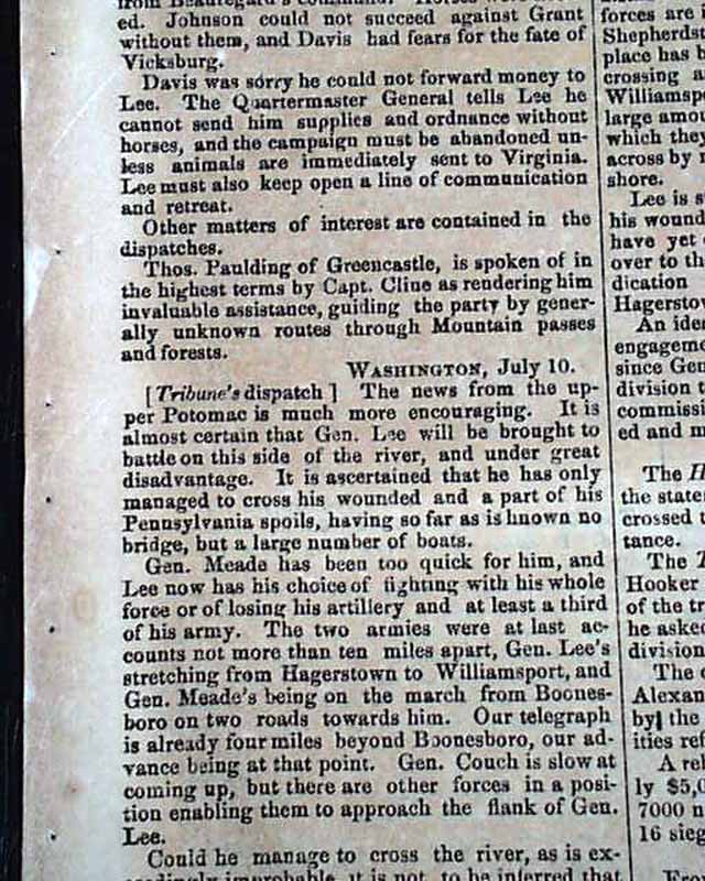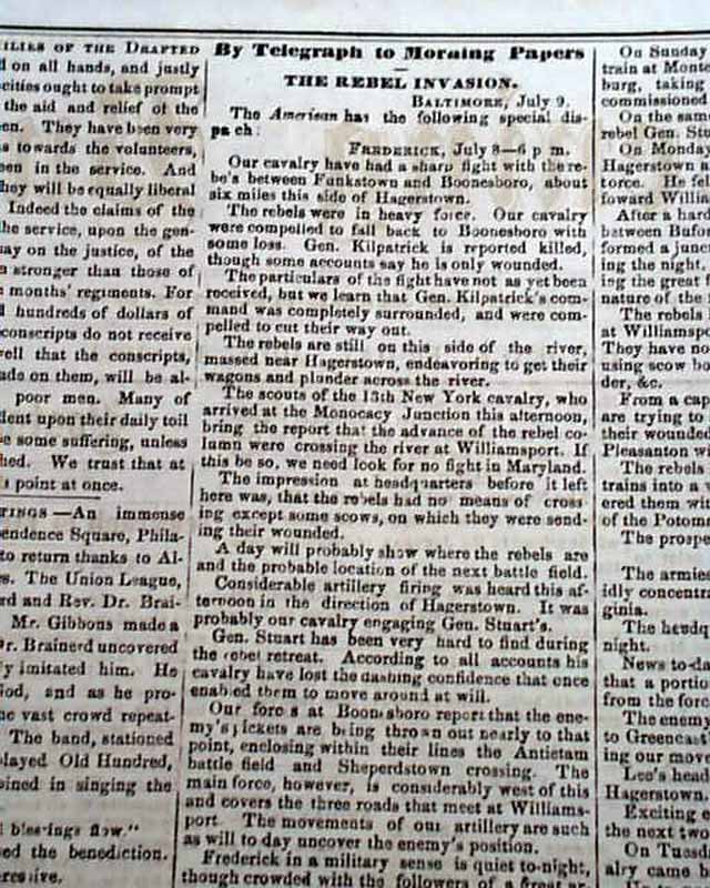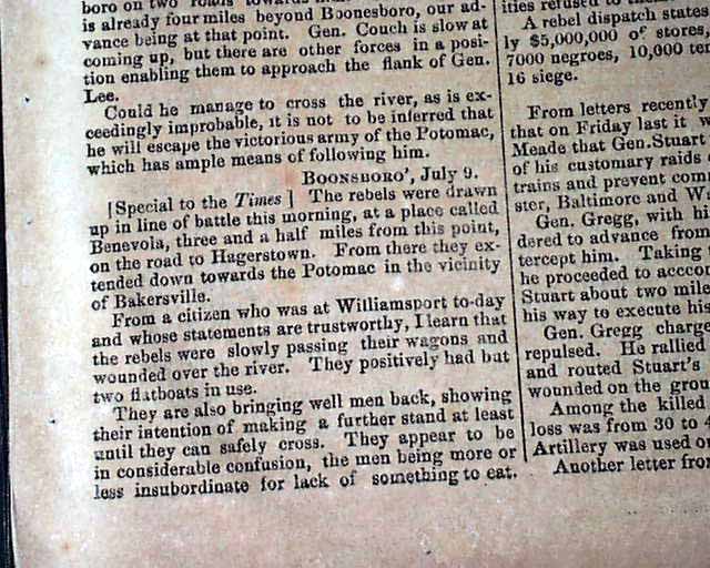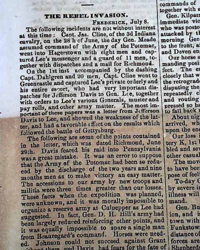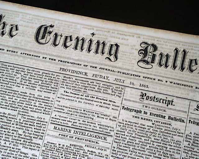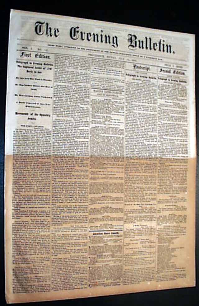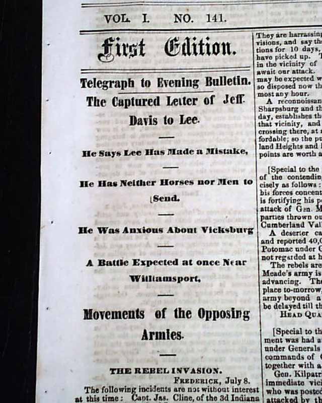 THE EVENING BULLETIN, Providence, Rhode Island, July 10, 1863 The first column heads on the front page include: "The Captured Letter of Jeff. Davis to Lee" "He Says Lee Has Made a Mistake' "He Has Neither Horses nor Men to Send" "He Was Anxious About Vicksburg" "A Battle Expected at Once Near Williamsport" "Movements of the Opposing Armies" "The Rebel Invasion". More war reporting inside.