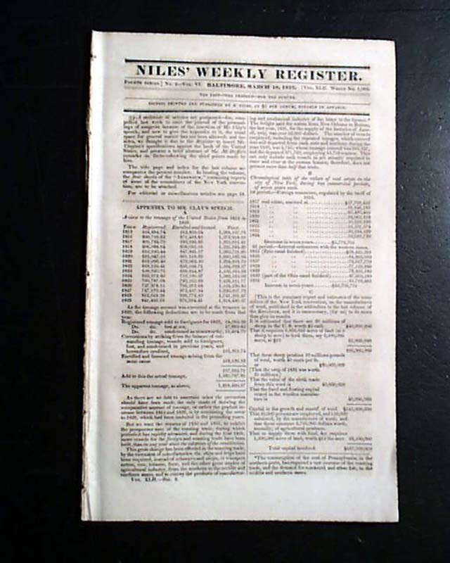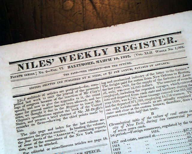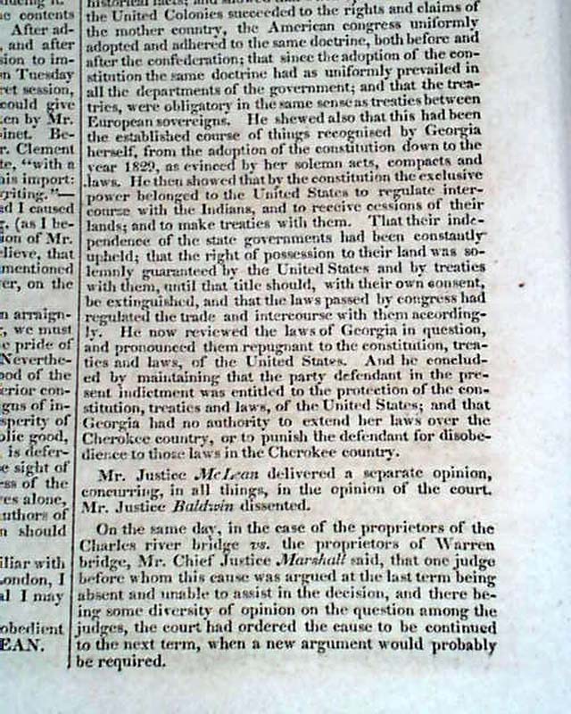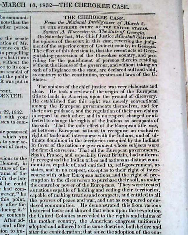 NILES' WEEKLY REGISTER, Baltimore, March 10, 1832  Inside has a very notable Supreme Court case, "The Cherokee Case", being Samuel A. Worcester vs. the state of Georgia. In the case the U.S. Supreme Court held that the Cherokee Indians constituted a nation holding distinct sovereign powers.