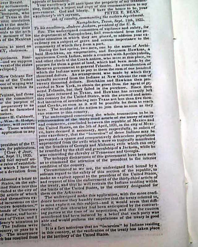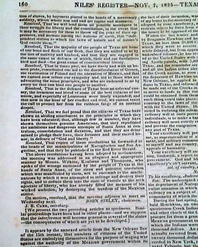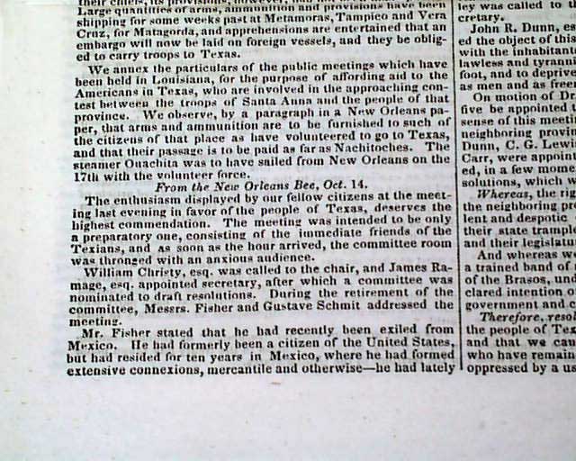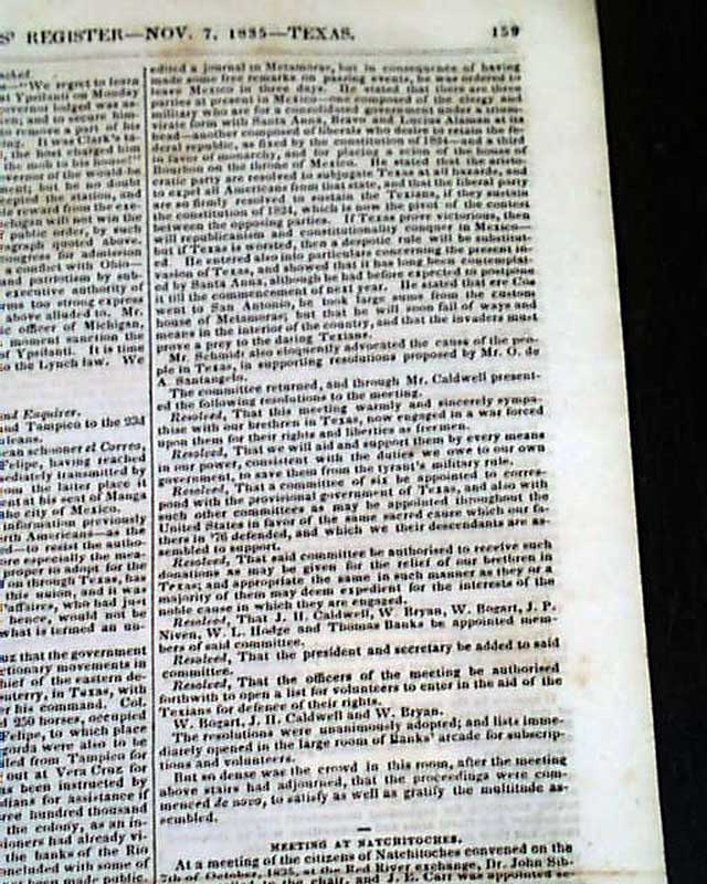 Included are: "....It was confidently asserted at Vera Cruz that the government was determined to put down the insurrectionary movements in Texas..." At a: "Meeting at Natchitoches" is reported: "...to express our sympathy with the inhabitants of Texas who are about to suffer from the lawless & tyrannical attempt to trample their liberties under foot & to deprive them of the rights & immunities to which as men and as freemen, they are entitled...Whereas, the rights & liberties of our fellow countrymen of the neighboring province of Texas are endangered by the violent & despotic course of general Santa Anna..." with more.