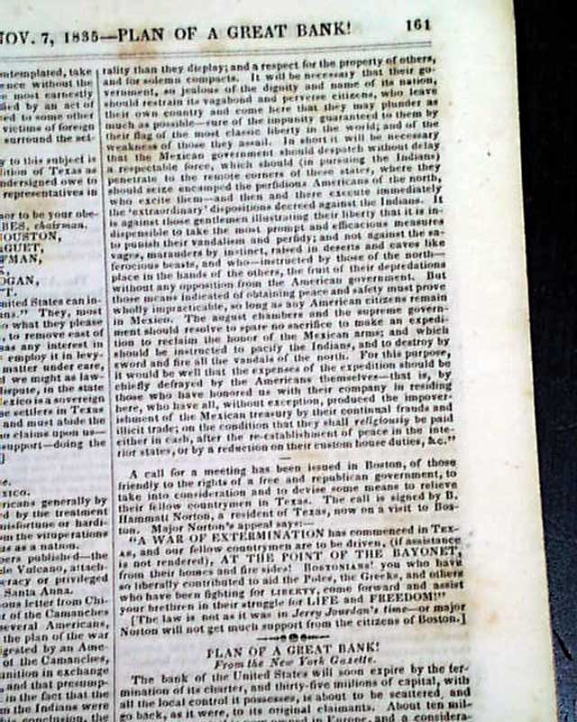 Yet another item includes: "A WAR OF EXTERMINATION has commenced in Texas, and our fellow countrymen are to be driven (if assistance is not rendered), AT THE POINT OF THE BAYONET from their homes & fire sides!...".