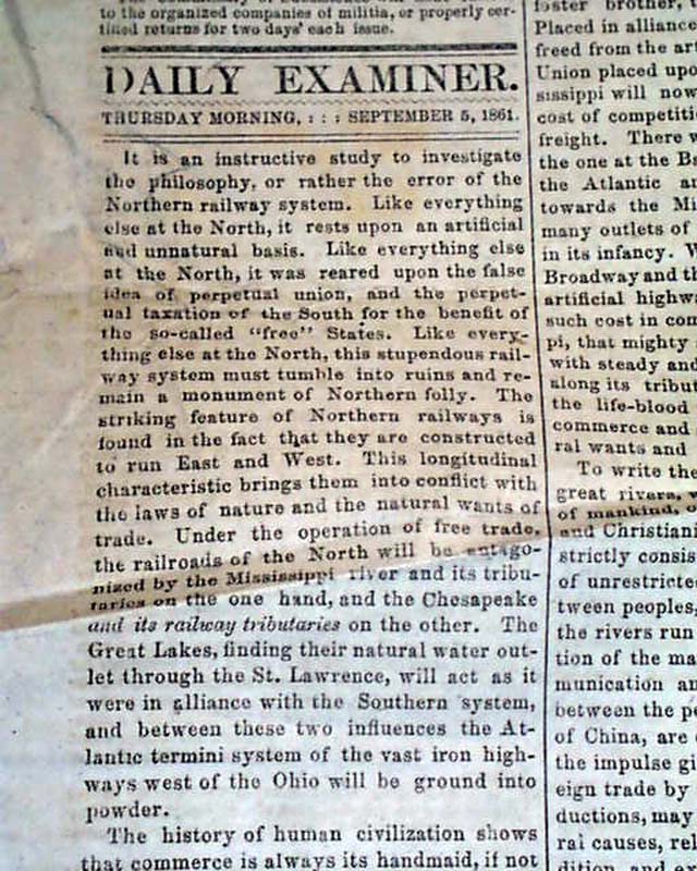 Page two contains a lengthy editorial, always a favorite part of this title as the editor was quite colorful and rabidly anti-North. Near the beginning is: "...the error of the Northern railway system. Like everything else at the North it rests upon an artificial & unnatural basis...it was reared upon the false idea of perpetual union & the perpetual taxation of the South for the benefit of the so-called 'free' states...must tumble into ruins and remain a monument of Northern folly..." and so much more.