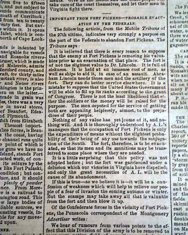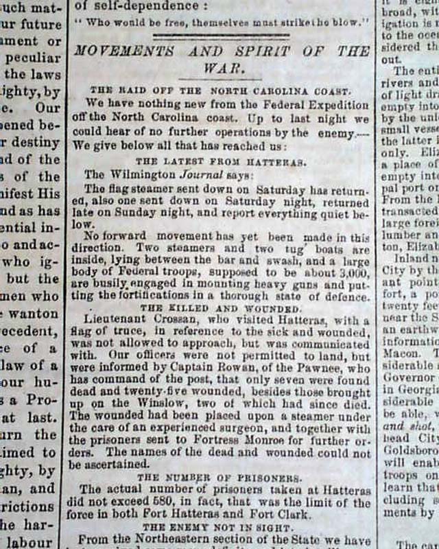 There is much other war reporting on page 2 with heads and subheads including: "Movements and Spirit of the War" "The Latest From Hatteras" "A Suspected Traitor" "The Feeling In Wilmington" "Important From Fort Pickens--Probable Evacuation by the Federals" and more.