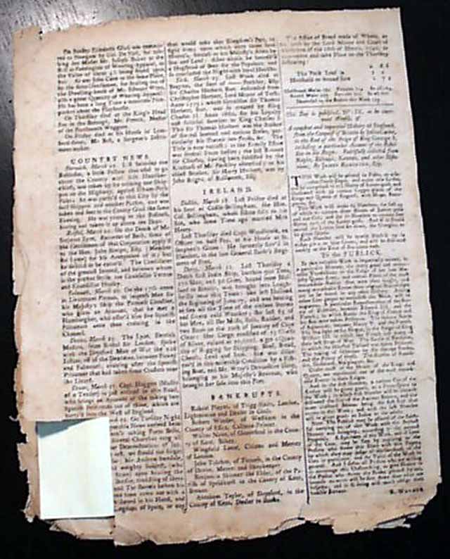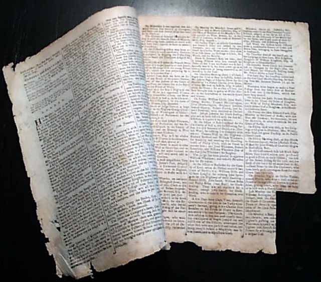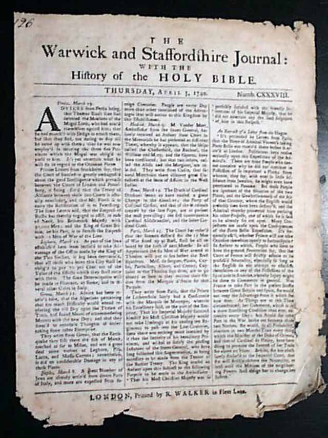 THE WARWICK & STAFFORDSHIRE JOURNAL WITH THE HISTORY OF THE HOLY BIBLE, London, April 3, 1740 This is a title I have never seen before, prior to acquiring several issues, and is quite rare as such. Records show this title only lasted from late 1737 to mid-1739. We believe this is the last issue in our inventory.