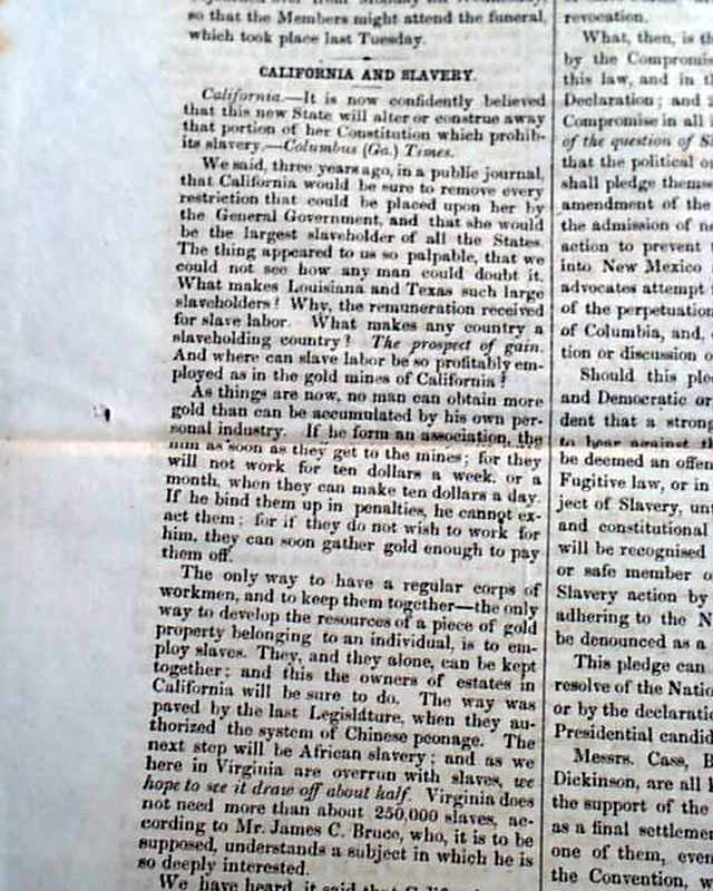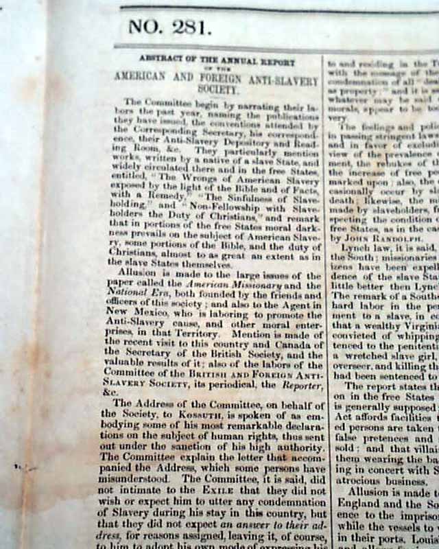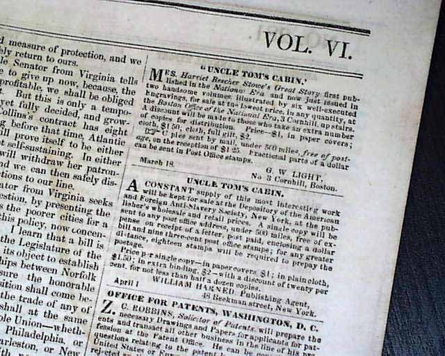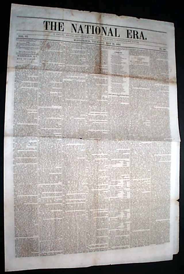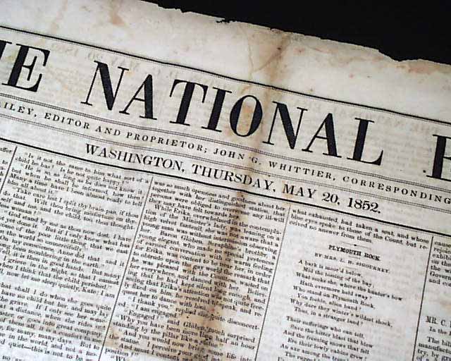 THE NATIONAL ERA, Washington, D.C., May 20, 1852 The back page has not one, but two advertisements for the sale of: "Uncle Tom's Cabin". One ad begins: "A constant supply of this most interesting work will be kept for sale..." and the other begins: "Mrs. Harriet Beecher Stowe's Great Story, first published in the 'National Era' and now just issued in two handsome volumes..." with more. Also in this issue: ""The Compromise Agitation" "The Presidency" "California & Slavery" and more.