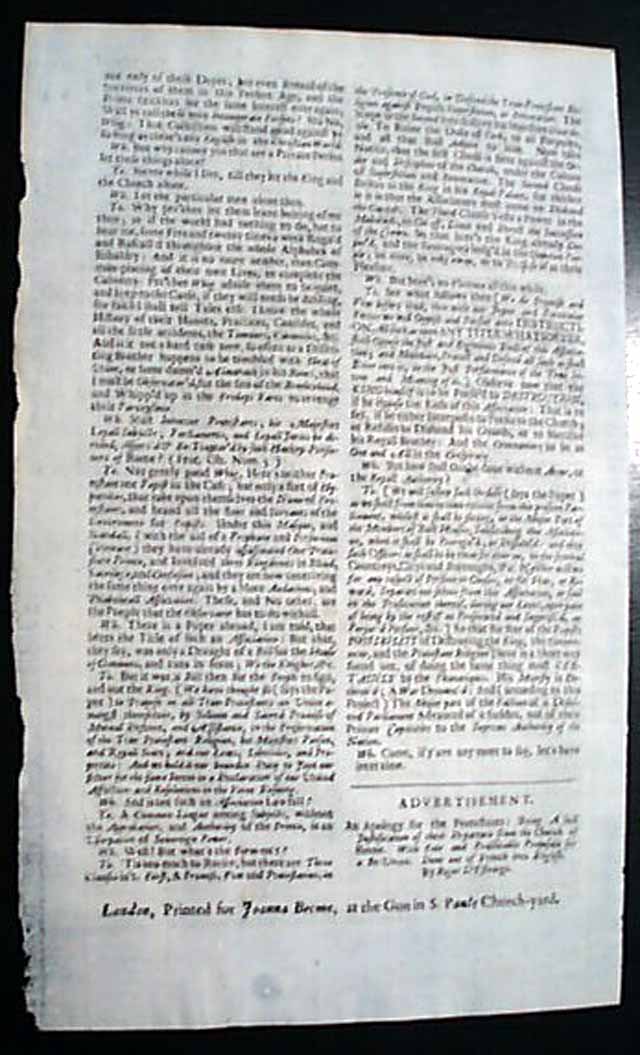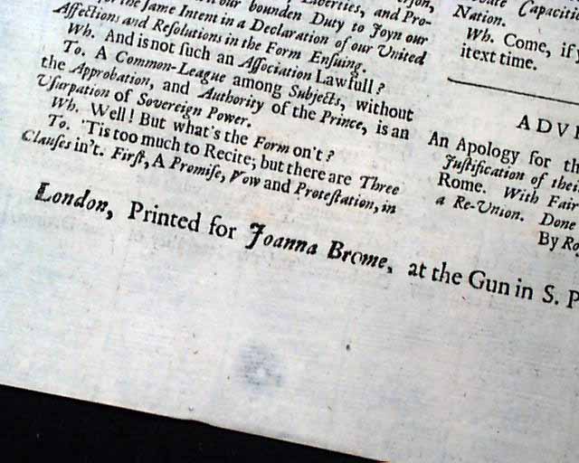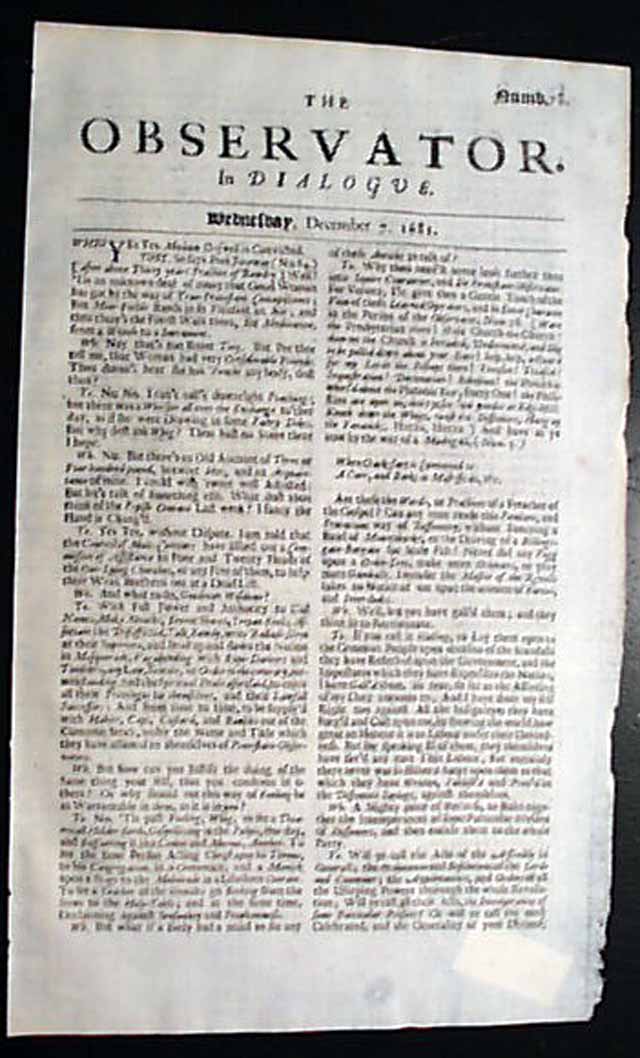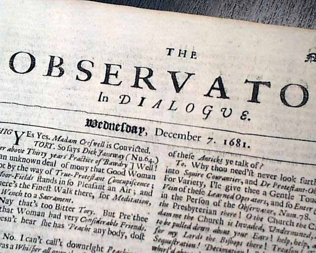 THE OBSERVATOR, London, Dec. 7, 1681 This is a handsome dialogue newspaper founded by Sir Roger L'Estrange, a Tory pamphleteer, as a vehicle for attacking dissenters and Whigs. Done in a dialogue format, between Whig & Tory. This early single sheet newspaper has the old style type making it great for framing, but the most intriguing aspect of this issue is that the imprint at the bottom of the back page reads: "London, Printed for Joanna Brome, at the Gun in S. Paul's Church-yard."