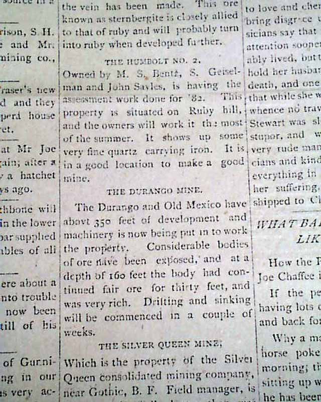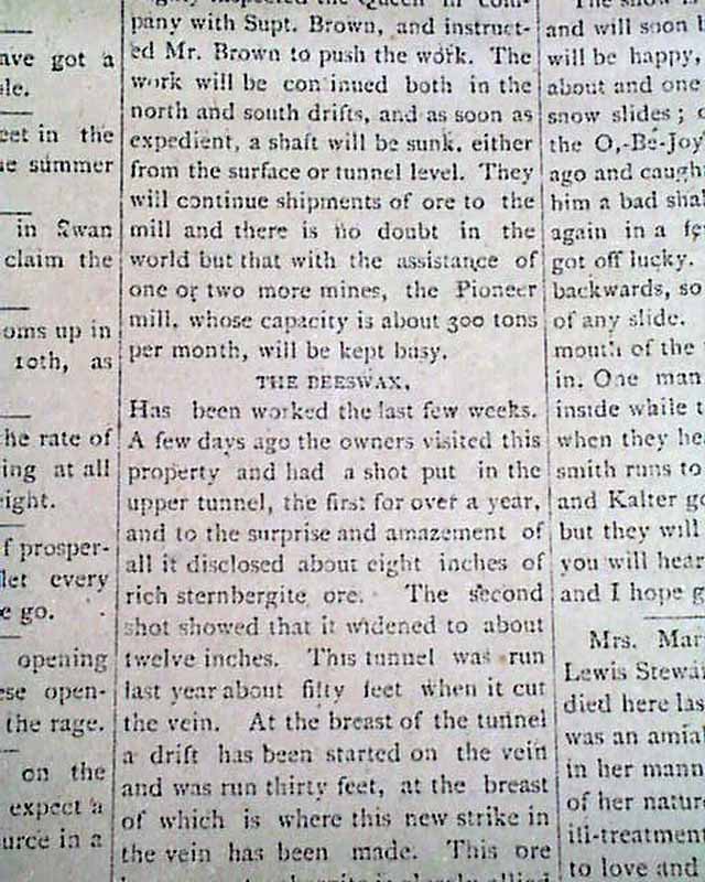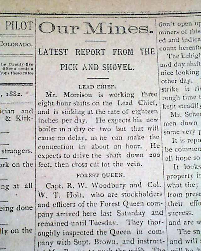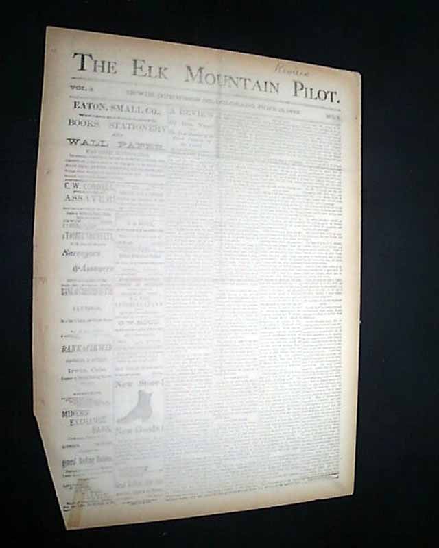 THE ELK MOUNTAIN PILOT, Irwin, Gunnison County, Colorado, June 15, 1882 A quite rare mining town camp newspaper which lasted about 5 years. At the turn of the 19th century this title was resurrected in nearby Crested Butte. The only holdings of this title from Irwin noted in Gregory (Union List of American Newspapers) by any institution have since been purchased by us.