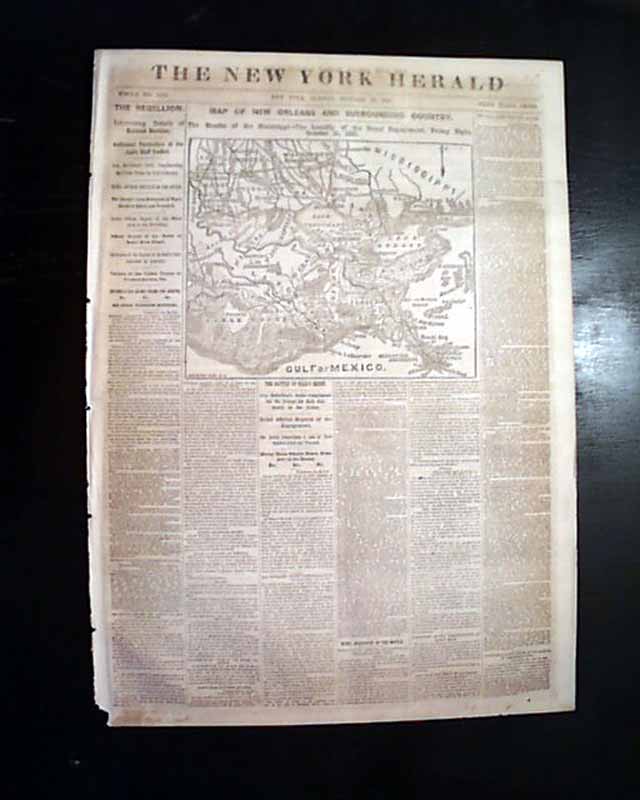 AI notes: The October 27, 1861, issue of the New York Herald is notable for carrying a detailed Civil War map of the New Orleans region, produced at a moment when the Union was increasingly focused on the Mississippi River and the strategic value of the Gulf Coast. Although New Orleans would not fall until April 1862, the Herald—the nation’s largest-circulation newspaper—used such maps to help readers visualize potential Union naval and military operations against the Confederacy’s most important port. The map typically highlighted the lower Mississippi River, surrounding bayous, Lake Pontchartrain, Forts Jackson and St. Philip, and key waterways leading to the city, emphasizing how control of river approaches could isolate New Orleans economically and militarily. These cartographic supplements reflected the Herald’s aggressive war coverage under editor James Gordon Bennett Sr., blending journalism with strategic illustration to shape Northern public understanding of where the war might turn next.