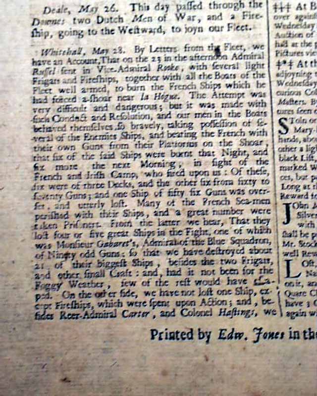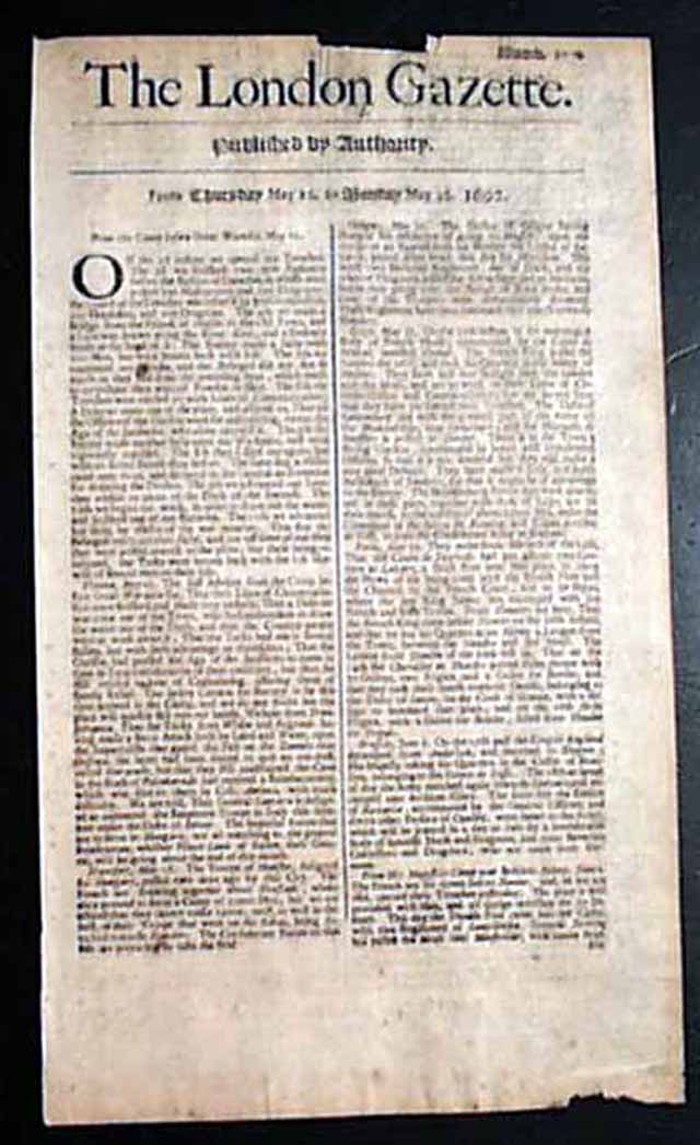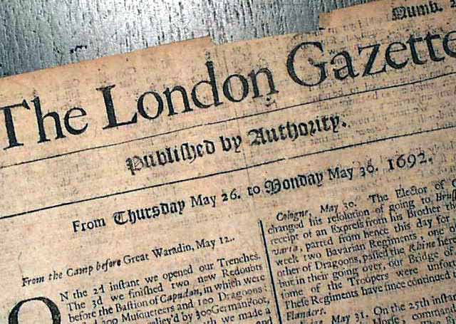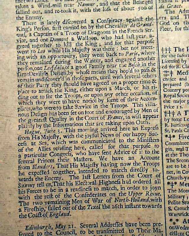 THE LONDON GAZETTE, England, May 30, 1692 The back page has a report beginning: "There is lately discovered a conspiracy against the King's person, first carried on by the Chevalier de Grandval, a caption of a troop of dragoons in the French service..." with details on the attempt to murder the King of England.