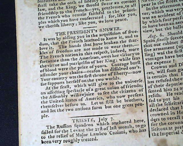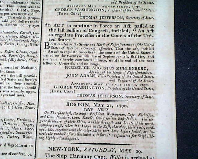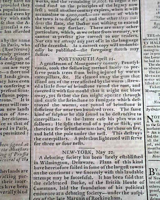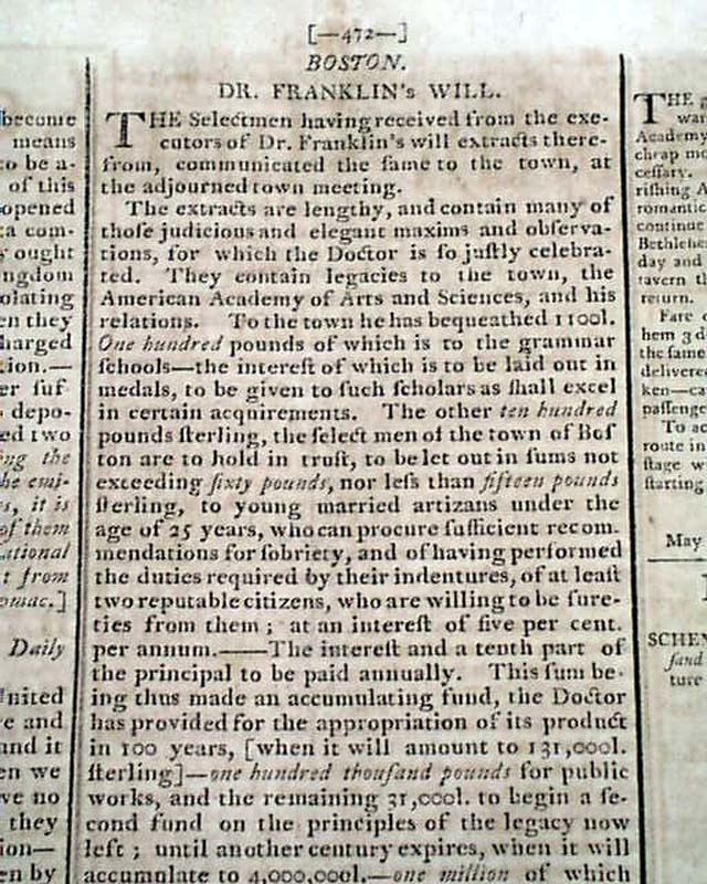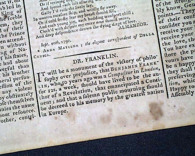 The front page has a brief item on the death of Ben Franklin headed: "Dr. Franklin" and noting: "...that Benjamin Franklin, who 50 years ago was a compositor in London for 12 shillings a week, should have lived to be the author o a Revolution that emancipated a continents; and that a solemn public mourning should be decreed to his memory by the greatest nation in Europe."