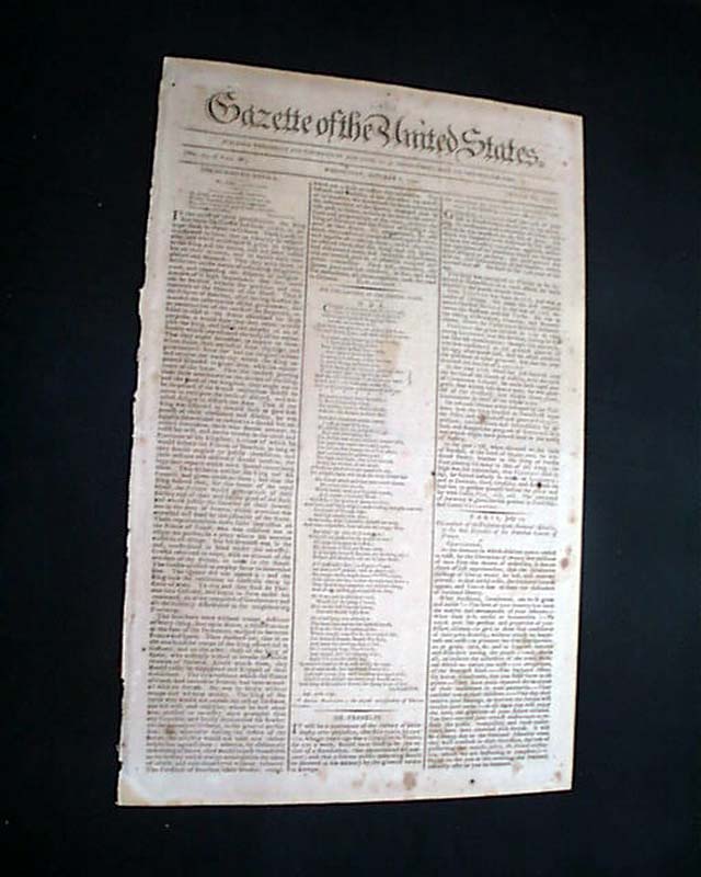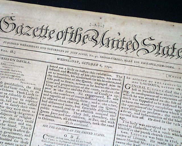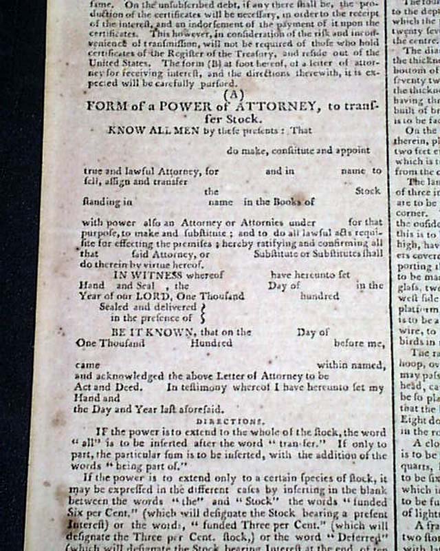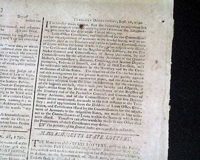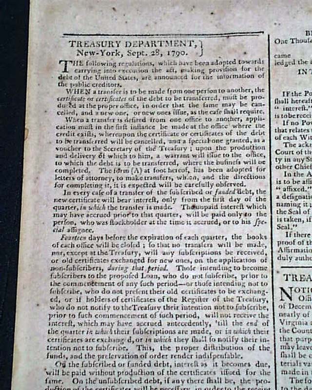 GAZETTE OF THE UNITED STATES, New York, Oct. 6, 1790 The back page has not one, but two documents from the "Treasury Department" concerning carrying into effect the historic Funding Act of 1790, whereby the new federal government would assume the debts of the individual states incurred during the Revolutionary War.