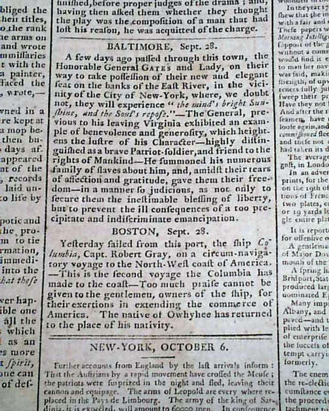 A page 3 report from Boston notes: "Yesterday, sailed from this report, the ship Columbia, Capt. Robert Gray, on a circum-navigatory voyage to the North-West coast of America. This is the second voyage the Columbia has made to the coast...The native of Owhyhee [Hawaii] has returned to the place of his nativity."