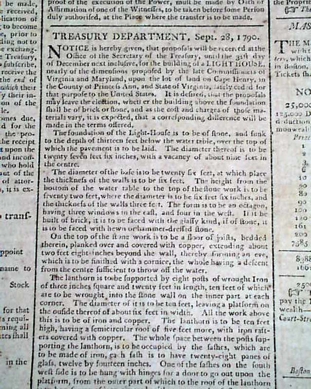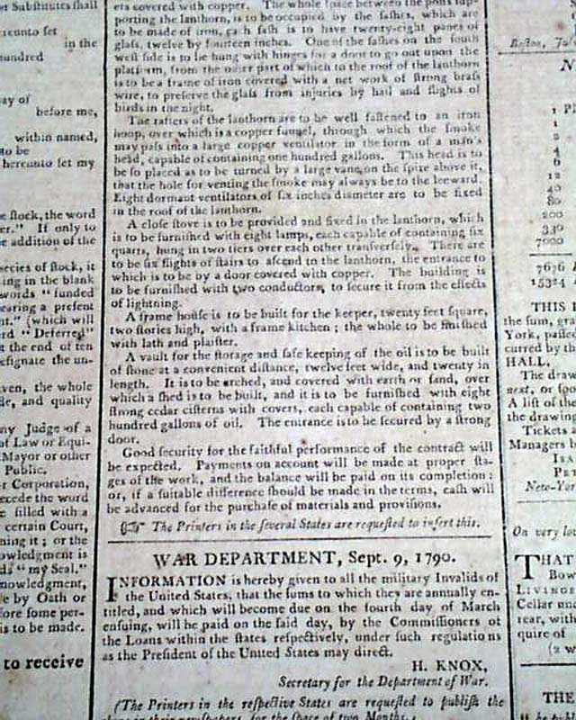The back page also has a "Treasury Department" document on seeking bids to build what would become the historic Cape Henry Light House in Virginia. And a small item from the "War Department signed: H. Knox, on pensions to soldiers from the war.