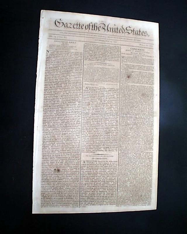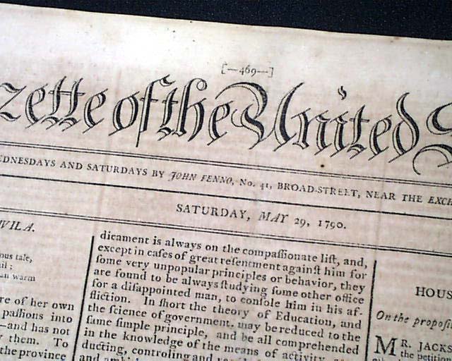 GAZETTE OF THE UNITED STATES, New York, May 29, 1790 On page 3 beneath a woodcut of an eagle and shield are: "Laws Of The United States Published By Authority" containing: "An Act to prescribe the mode in which the public Acts, Records, and Judicial Proceedings in each state...", signed in type: John Adams, George Washington & Thomas Jefferson, plus a second Act concerning regulating the processes in the Courts of the United States, also signed in type by the same three gentlemen.