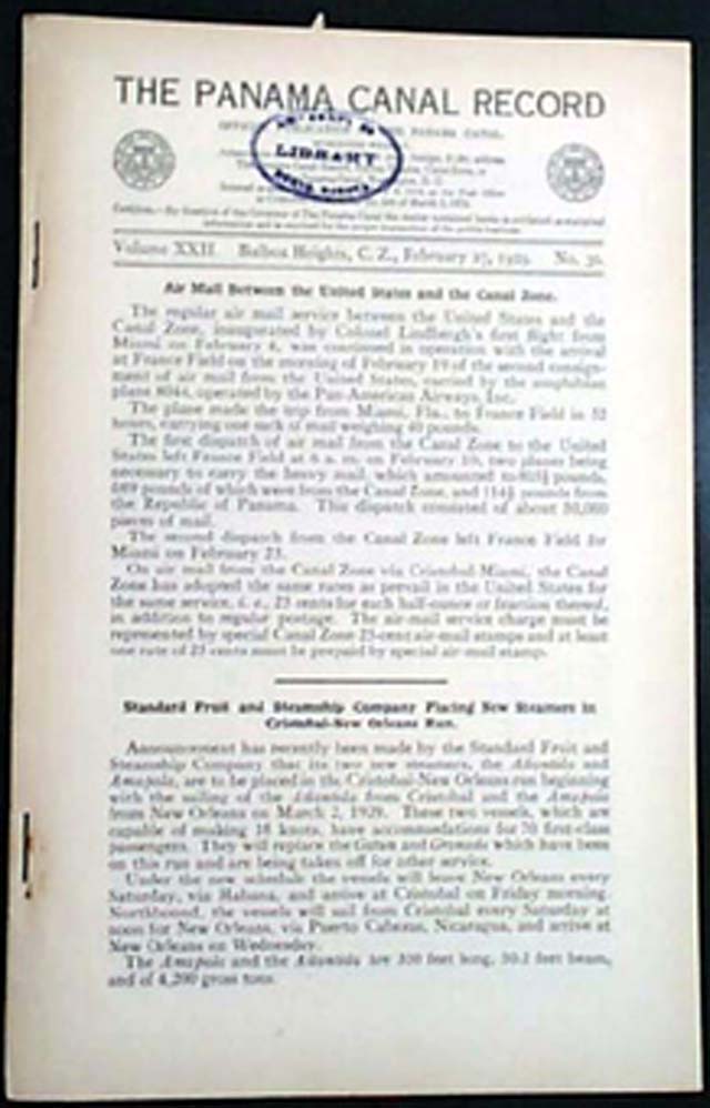 THE PANAMA CANAL RECORD, Balboa Heights, Canal Zone, Feb. 27, 1928 A little magazine noted as the: "Official Publication of the Panama Canal" with a wealth of data concerning the canal and its use including several charts on what is passing through the canal.