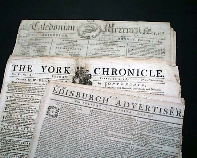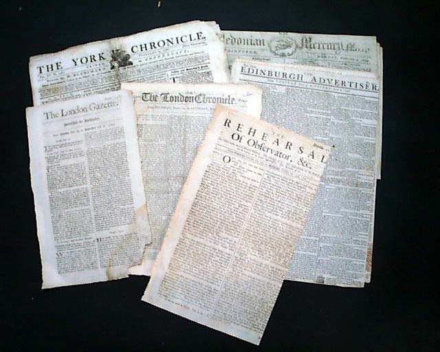 A lot of 6 issues of British titles, all different, all with damage. London Gazette, 1687; The Rehearsal, 1704; London Chronicle, 1785; The York Chronicle, 1787; Caledonian Mercury, 1793; and Edinburgh Advertiser, 1798.